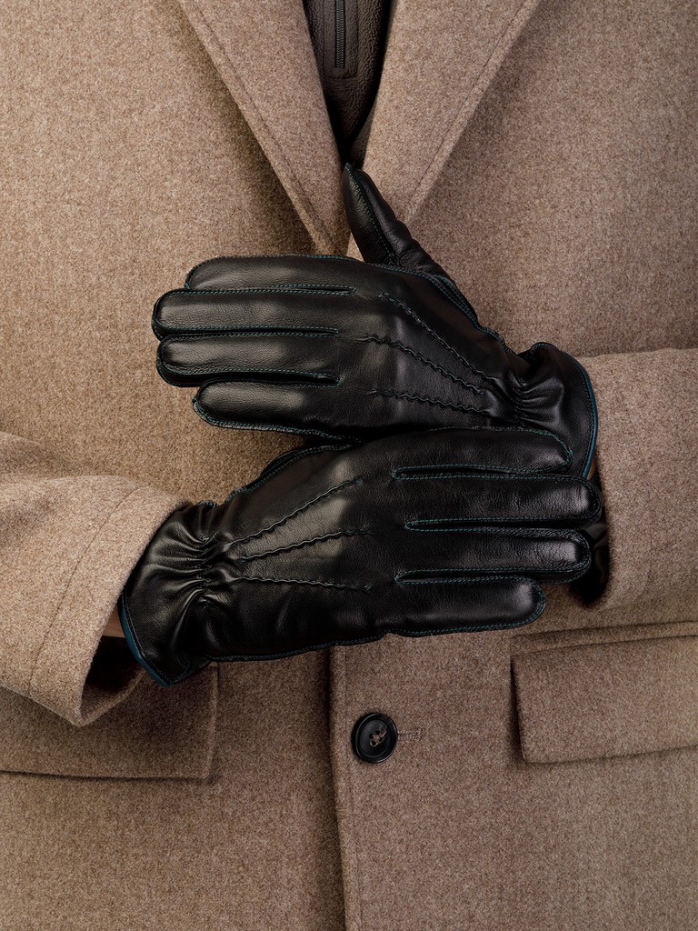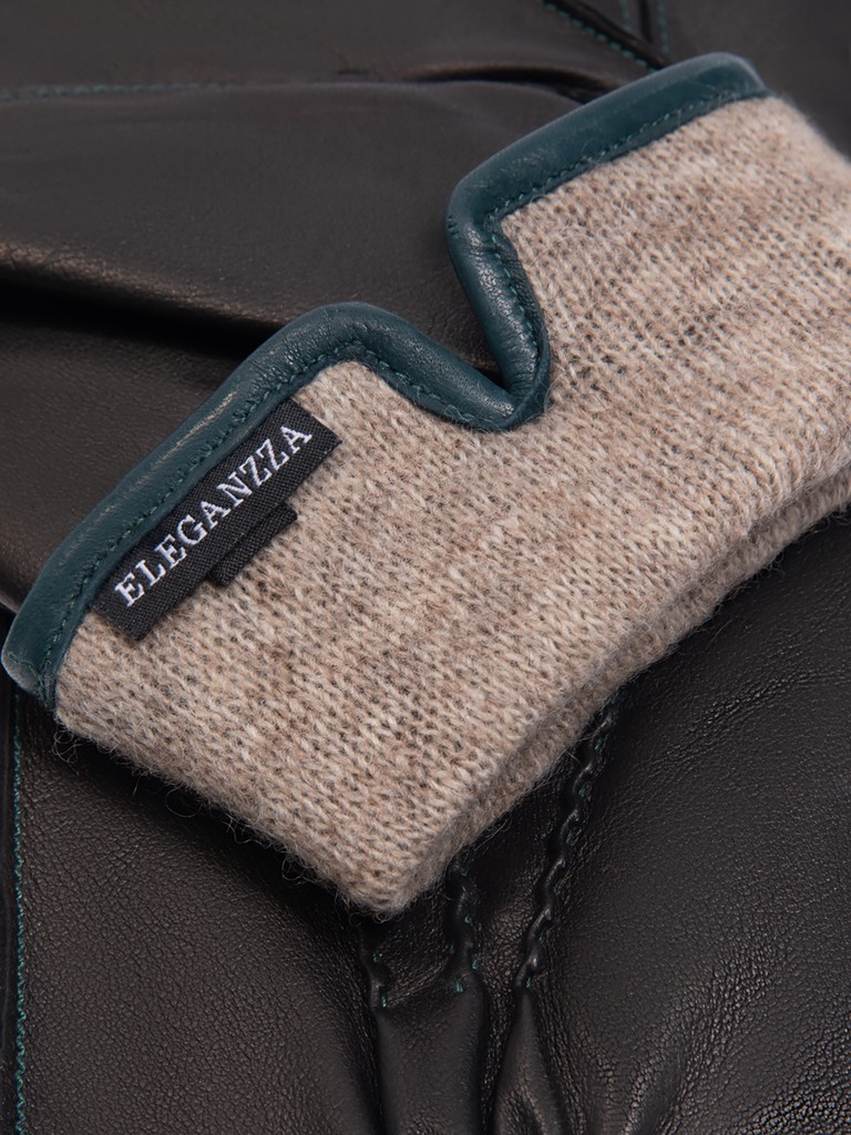Перчатки торговой марки ELEGANZZA производства Италии выполнены из натуральной кожи черного цвета. Подкладка: 85%шерсть, 15%кашемир. Отделка - декоративные швы "три луча". На ладонной стороне разрез. Все строчки нитками и отделка края манжеты выполнены кожей контрастного темно-зеленого цвета. Длина манжеты от нижней точки большого пальца до края перчаток - 5 см. Длина пальцев - средняя.