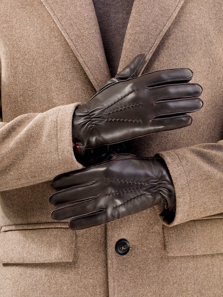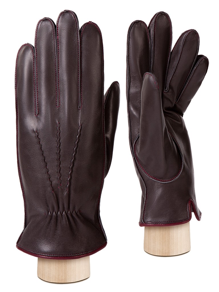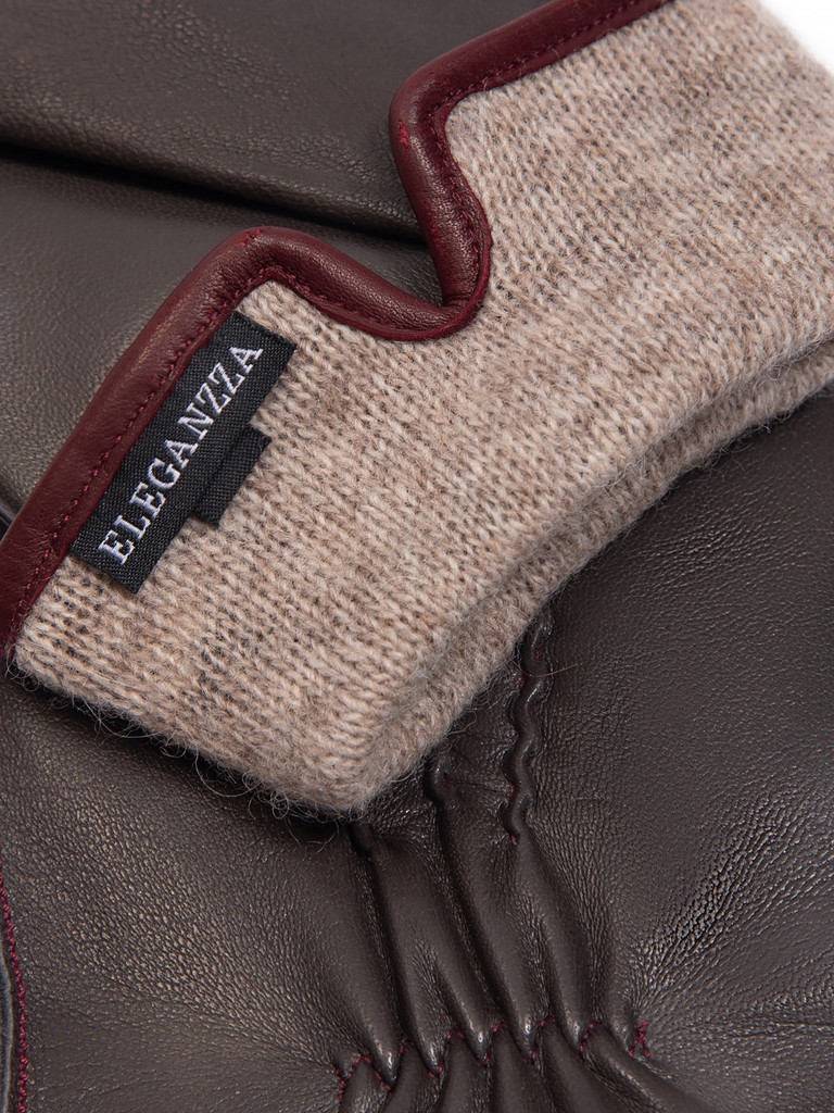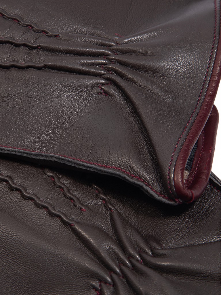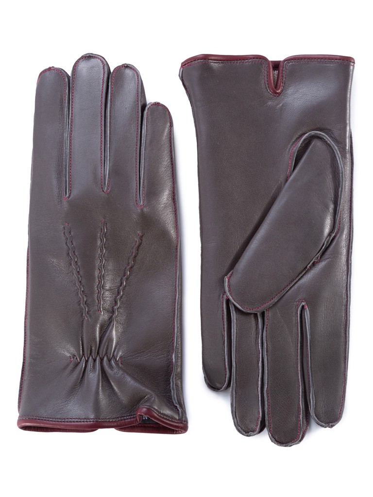 Перчатки торговой марки ELEGANZZA производства Италии выполнены из натуральной кожи темно-серого цвета. Подкладка: 85%шерсть, 15%кашемир. Отделка - декоративные швы "три луча". На ладонной стороне разрез. Все строчки нитками и отделка края манжеты выполнены кожей контрастного темно-бордового цвета. Длина манжеты от нижней точки большого пальца до края перчаток - 5 см. Длина пальцев - средняя.