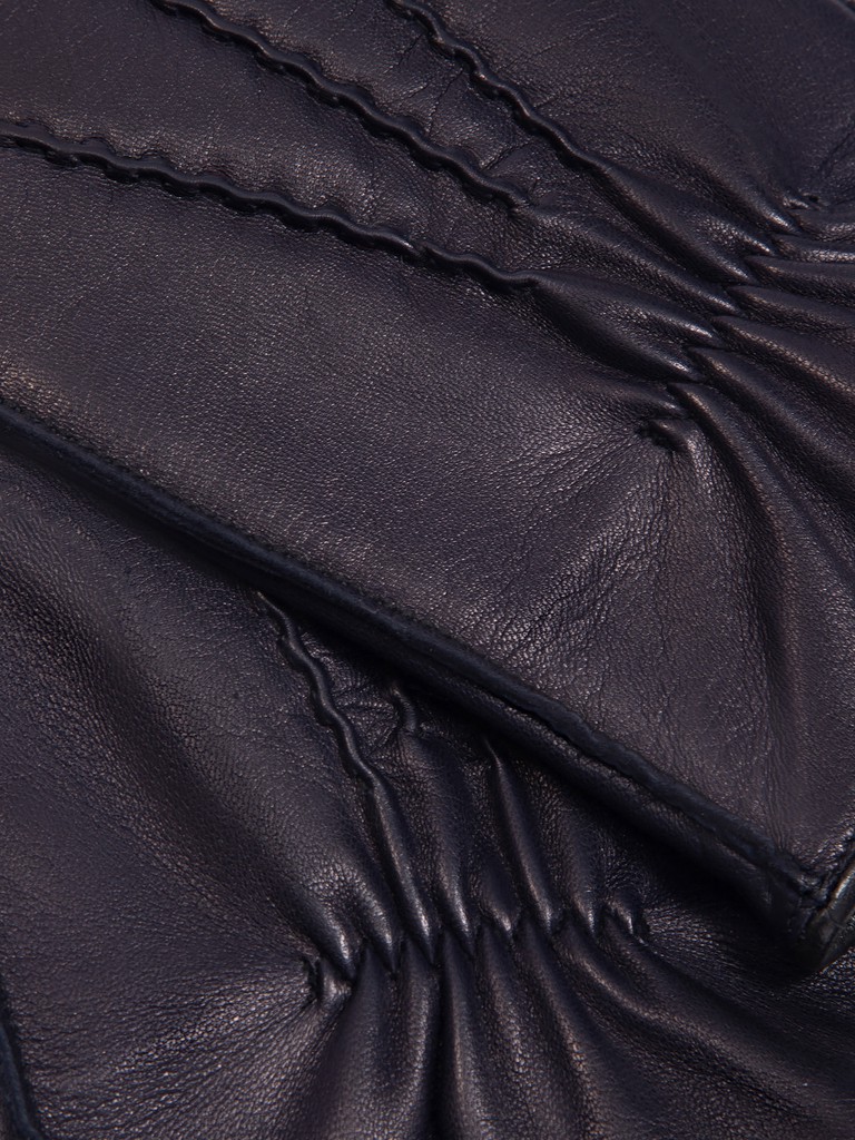 Перчатки торговой марки ELEGANZZA производства Италии выполнены из натуральной кожи темно-синего цвета. Подкладка: 85%шерсть, 15%кашемир. Отделка - декоративные швы "три луча". На ладонной стороне разрез. Все строчки нитками и отделка края манжеты выполнены кожей контрастного черного цвета. Длина манжеты от нижней точки большого пальца до края перчаток - 5 см. Длина пальцев - средняя.