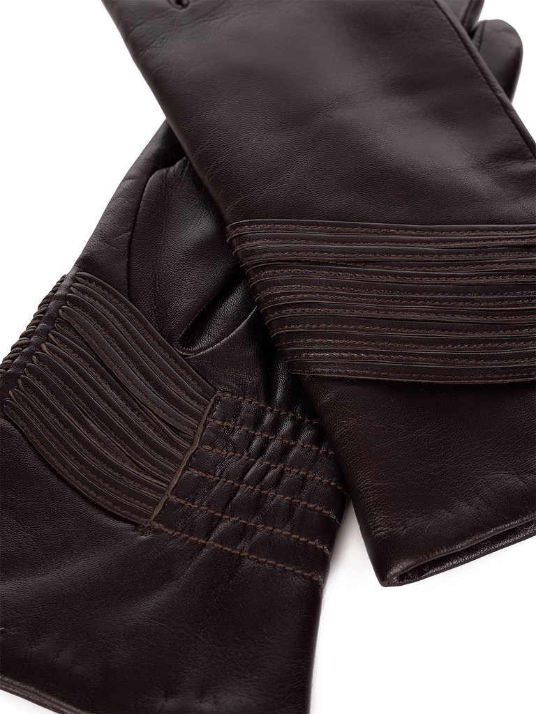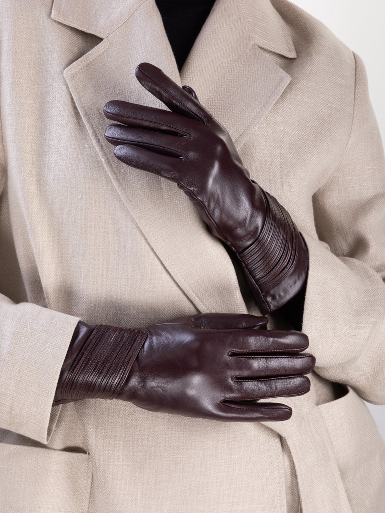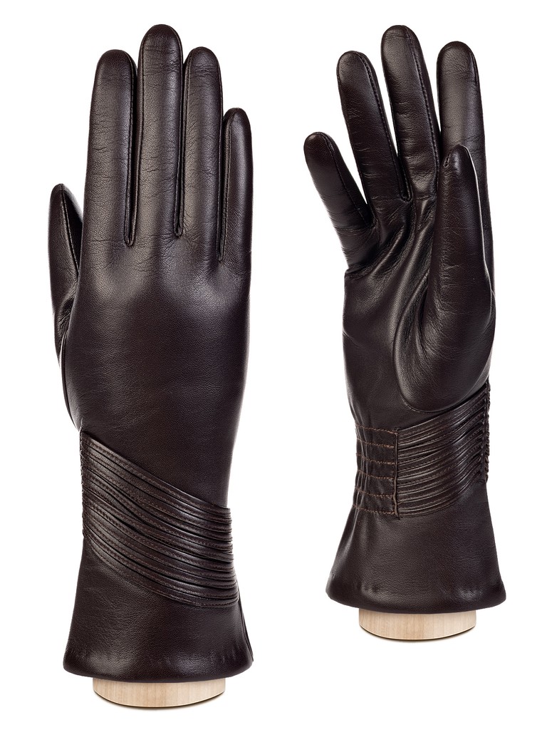 Перчатки торговой марки ELEGANZZA производства Китай выполнены из кожи ягнёнка. Подкладка: 100% шерсть. Отделка - декоративные узкие кожаные шнурки, которые крепятся в шов, имитируют браслет на запястье. На ладонной стороне широкая резинка. Длина манжеты от нижней точки большого пальца до края перчаток - 8,5 см. Длина пальцев - средняя.