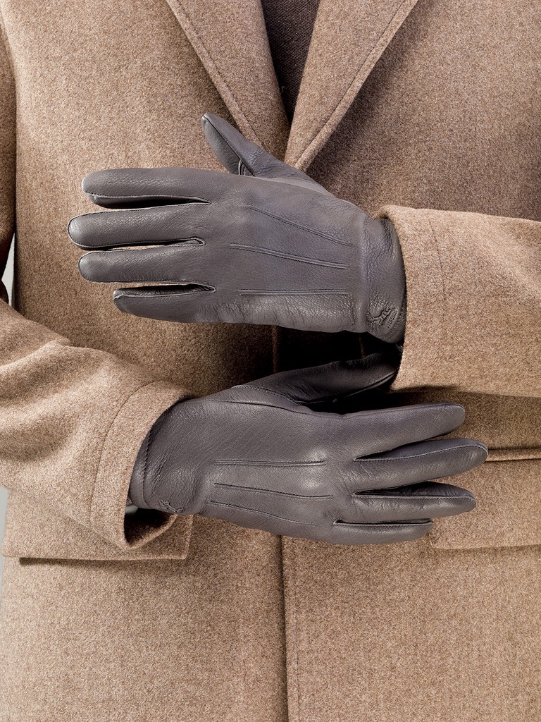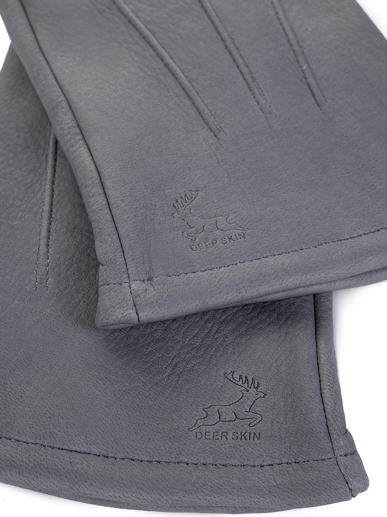 Перчатки торговой марки ELEGANZZA производства Китай выполнены из кожи оленя серого цвета. Подкладка: 100% шерсть. Отделка - декоративные швы "три луча". Резинка на ладонной стороне. Длина манжеты от нижней точки большого пальца до края перчаток - 5 см. Детали пальцев соединены внутренними швами (полустроковый).