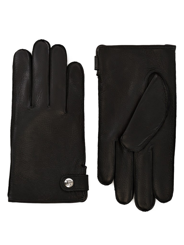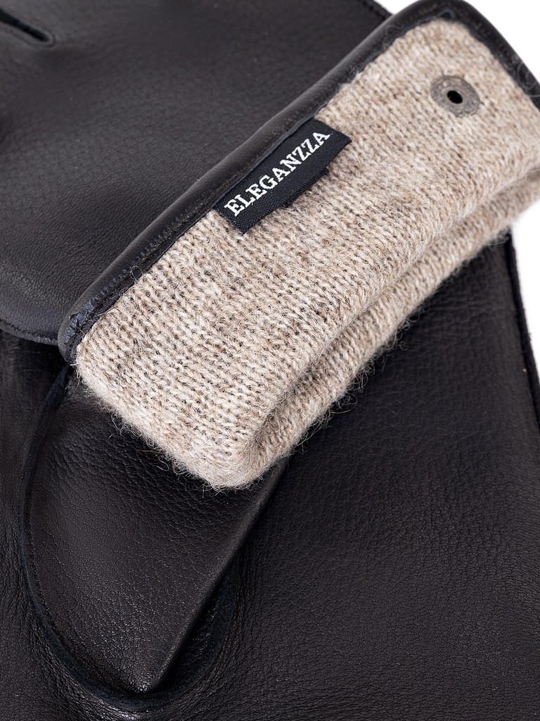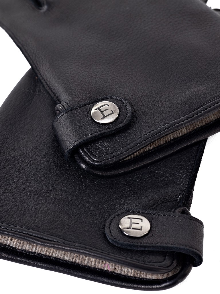Перчатки торговой марки ELEGANZZA производства Китай выполнены из кожи оленя черного цвета. Подкладка 100% шерсть. Отделка: декоративный ремень по боковому разрезу на кнопке с фирменной символикой. Модель с наружними машинными швами. Длина манжеты от нижней точки большого пальца до края перчаток - 4 см. Длина пальцев - средние.