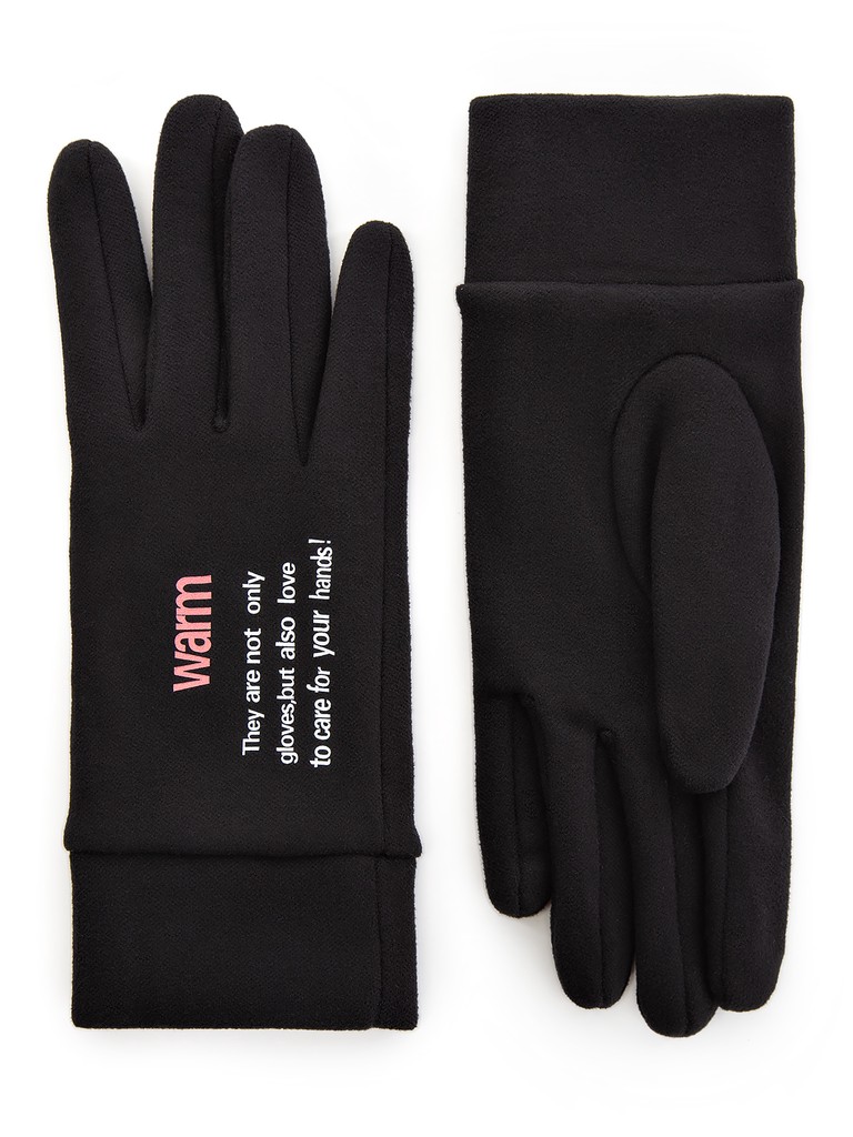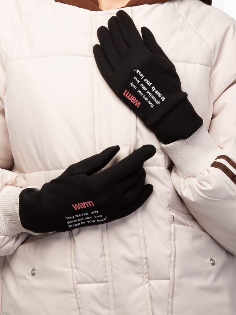 Перчатки торговой марки LABBRA производства Китай выполнены из трикотажного полотна. Состав трикотажа: 90% полиэстер, 10% эластан. На лицевой стороне текстовый принт. Длина манжеты от нижней точки большого пальца до края перчатки 6 см. Длина пальцев - средняя. Модель перчатки универсального размера, подойдёт на любую полноту руки благодаря хорошему стрейчу и эластичности трикотажа.