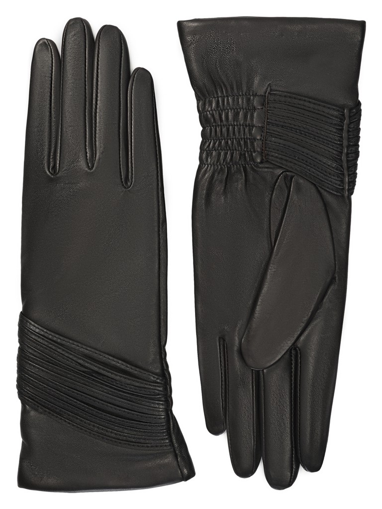 Перчатки торговой марки ELEGANZZA производства Китай выполнены из кожи ягнёнка. Подкладка: 100% шерсть. Отделка - декоративные узкие кожаные шнурки, которые крепятся в шов, имитируют браслет на запястье. На ладонной стороне широкая резинка. Длина манжеты от нижней точки большого пальца до края перчаток - 8,5 см. Длина пальцев - средняя.