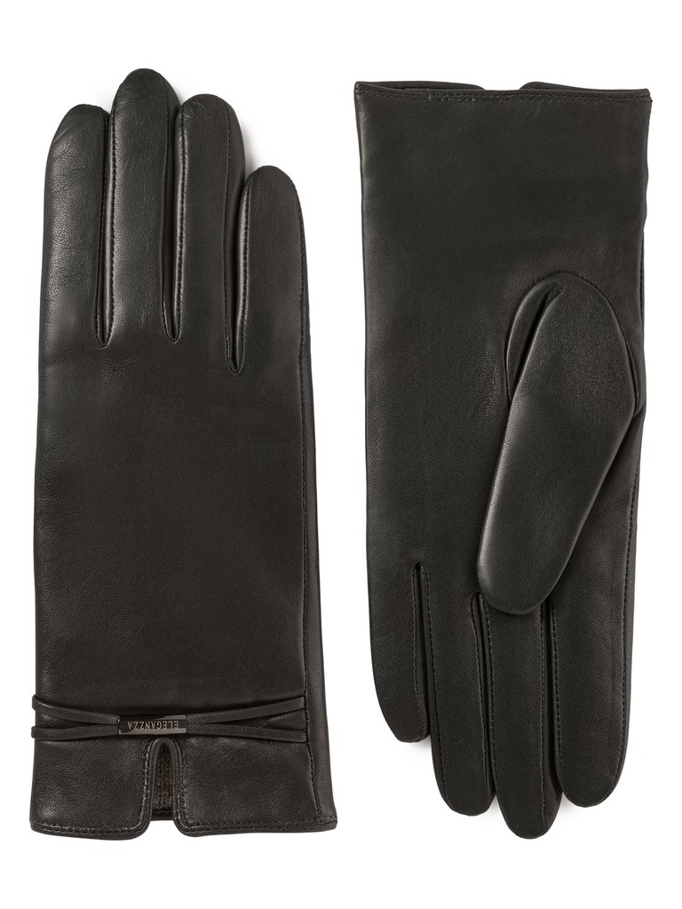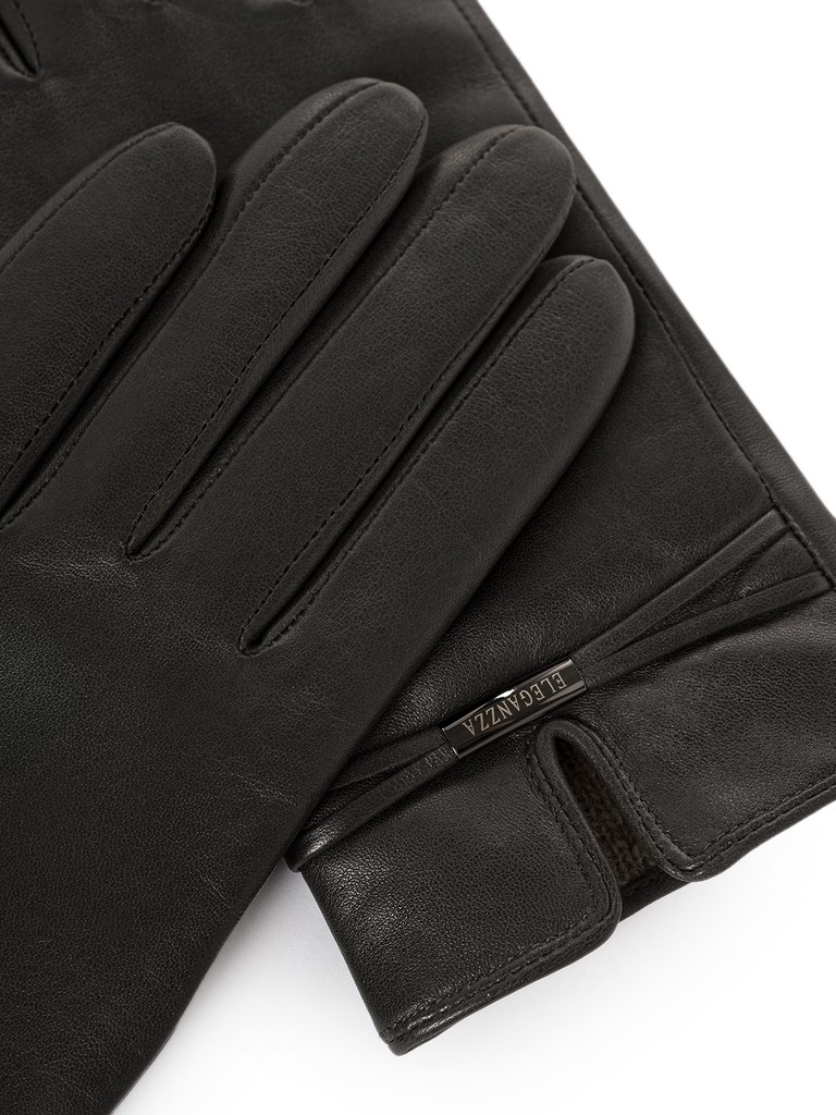Перчатки торговой марки ELEGANZZA производства Китай выполнены из кожи ягнёнка чёрного цвета. Подкладка: 100% шерсть. Декоративные элементы - фирменная фурнитура на узких кожаных ремнях. Нижний край перчатки и разрез на лицевой стороне окантованы. Длина манжеты от нижней точки большого пальца до края перчаток - 6 см.