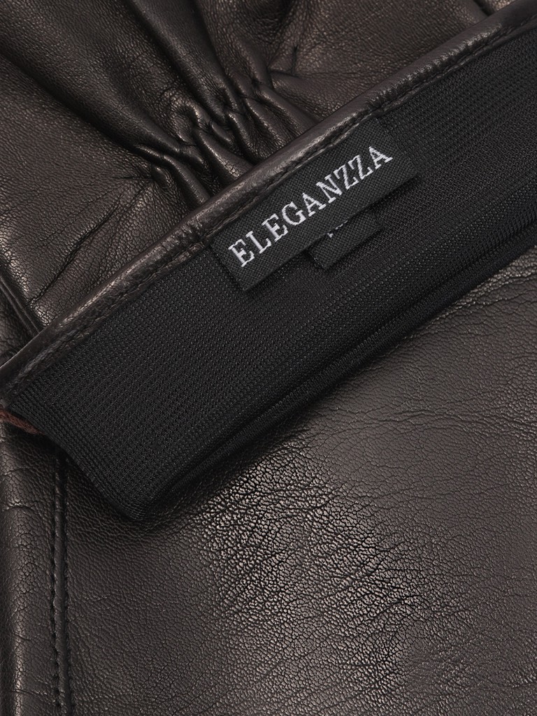 Перчатки торговой марки ELEGANZZA, выполнены из натуральной кожи ягнёнка производства Италии. Подкладка: шелк. Отделка - декоративные швы от нижнего края перчатки и до кончиков мизинца и указательного пальцев. Нижний край перчатки окантован. Резинка на ладонной стороне. Длина манжеты от нижней точки большого пальца до края перчаток - 8 см. Длина пальцев - средняя.