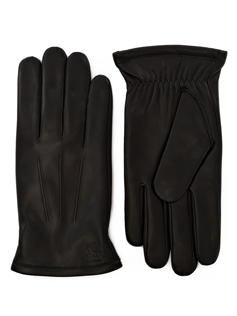 Перчатки торговой марки ELEGANZZA производства Китай выполнены из кожи оленя чёрного цвета. Подкладка: 100% шерсть. Отделка - декоративные швы "три луча". Резинка на ладонной стороне. Длина манжеты от нижней точки большого пальца до края перчаток - 5 см. Детали пальцев соединены внутренними швами (полустроковый).