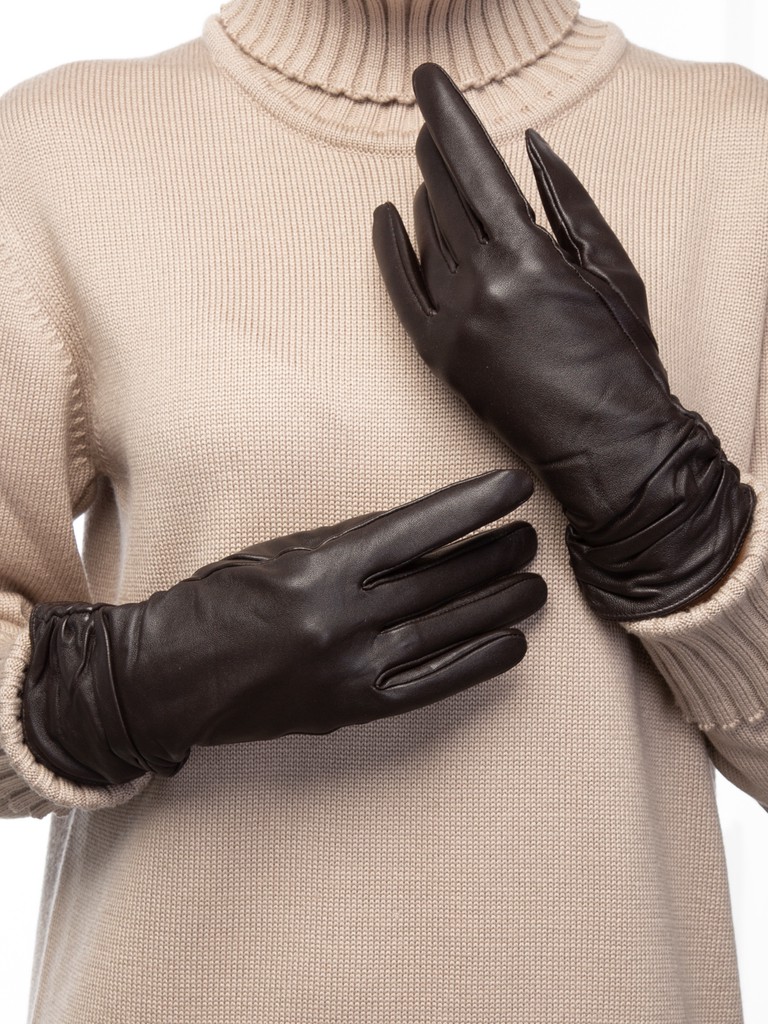 Перчатки торговой марки LABBRA из натуральной кожи ягненка. Производитель Китай. Подкладка: 70% шерсть + 30% акрил. Отделка - декоративная сборка по всей длине манжеты. Длина манжеты от нижней точки большого пальца до края перчаток - 11.5 см. Длина пальцев - средняя.