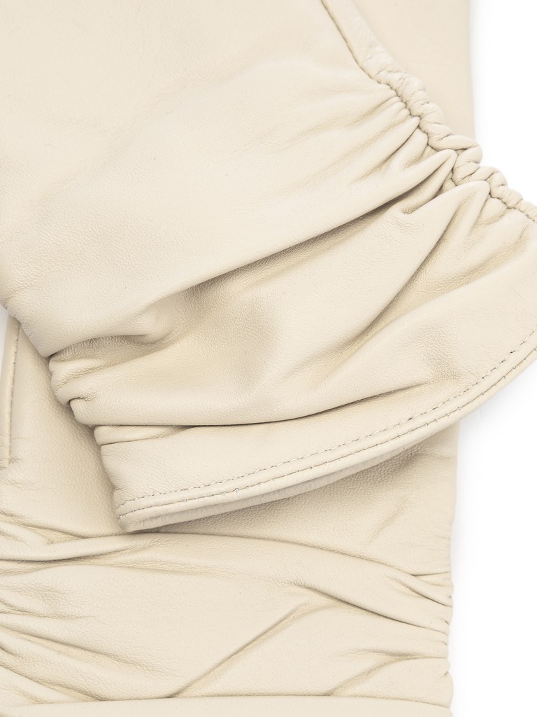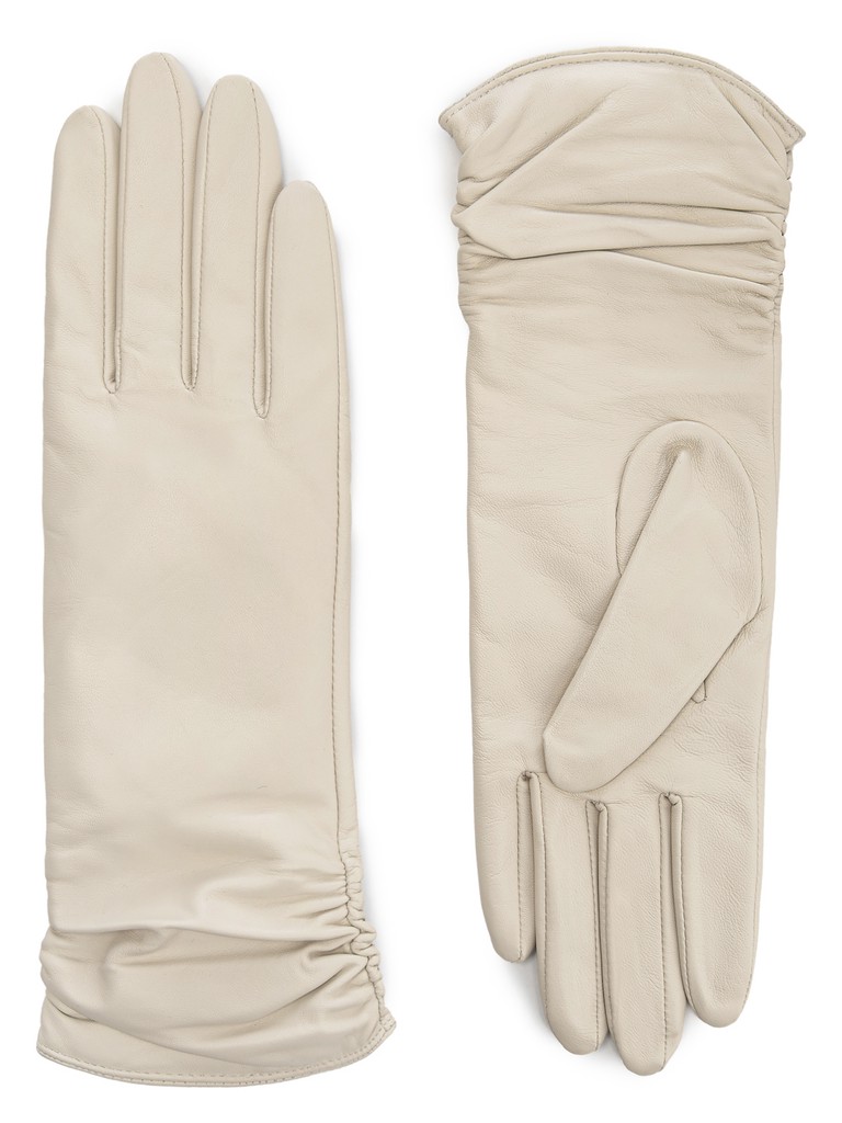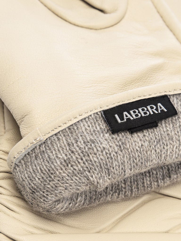 Перчатки торговой марки LABBRA из натуральной кожи ягненка. Производитель Китай. Подкладка: 70% шерсть + 30% акрил. Отделка - декоративная сборка по всей длине манжеты. Длина манжеты от нижней точки большого пальца до края перчаток - 11.5 см. Длина пальцев - средняя.