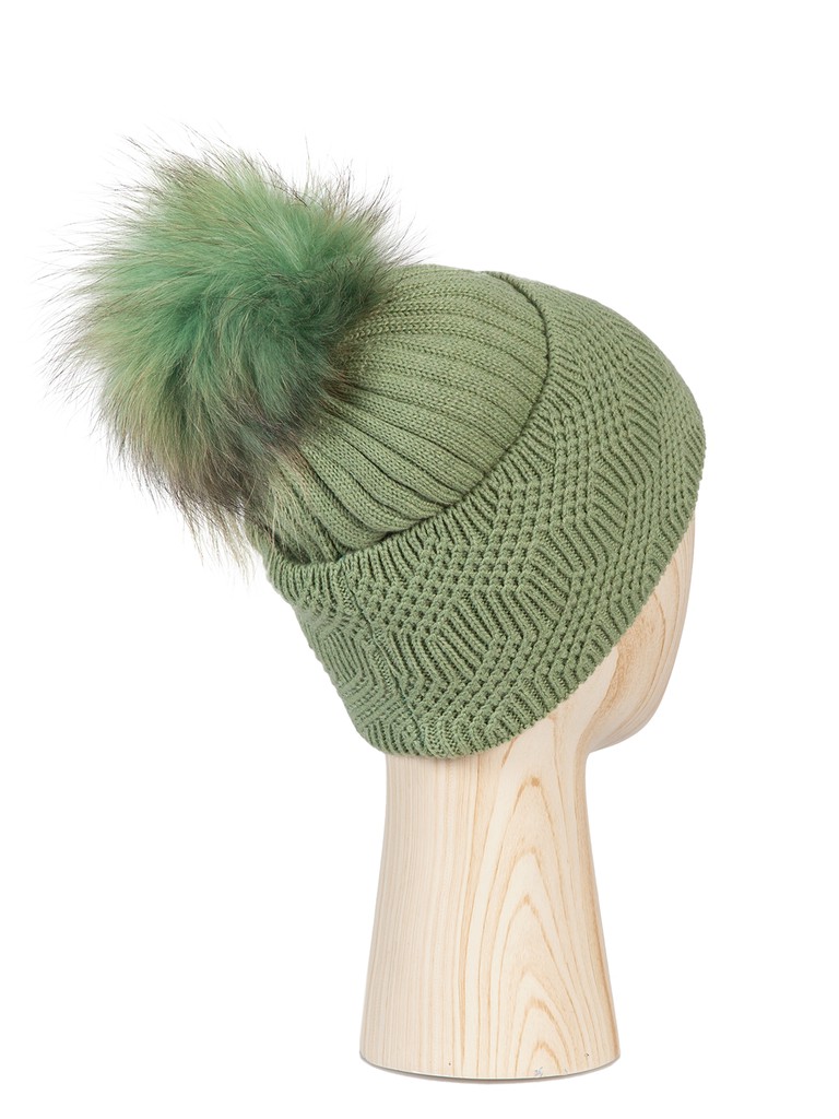 Классическая форма шапки-бини с отворотом из тонкой пряжи с добавлением шерсти и вискозы. Ажурная вязка, яркие цвета и натуральный съемный помпон из меха енота делают сделают ее любимым аксессуаром Вашего гардероба!