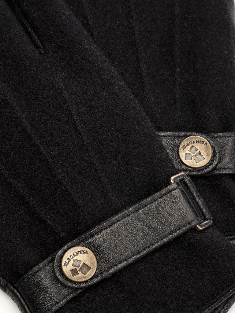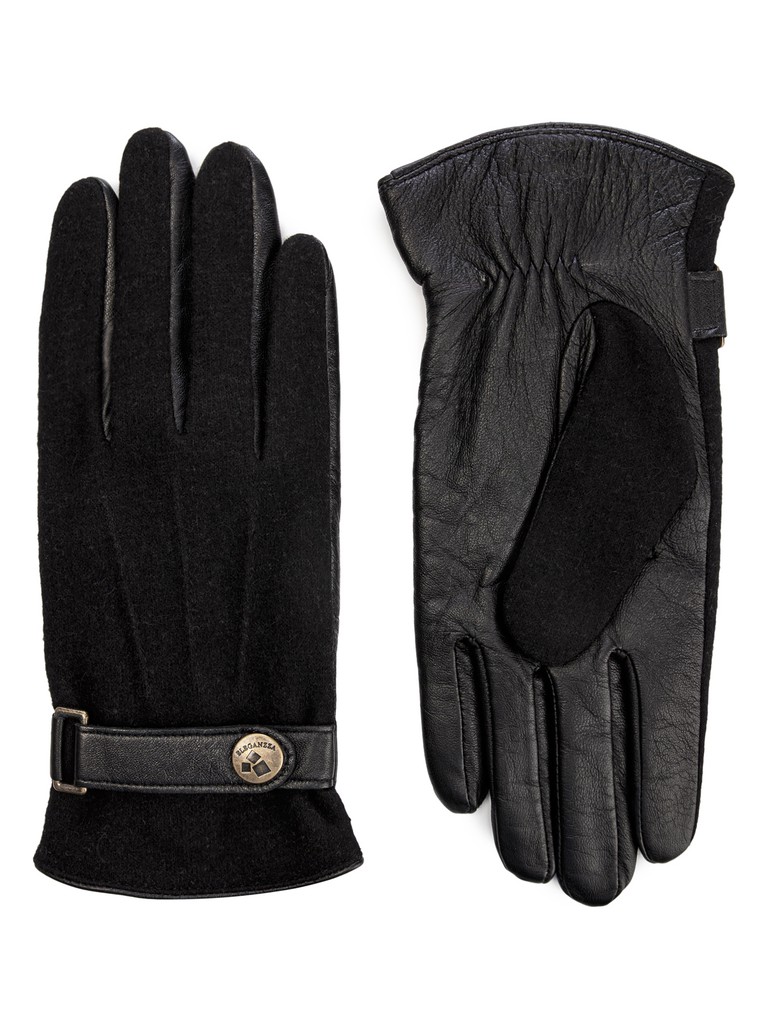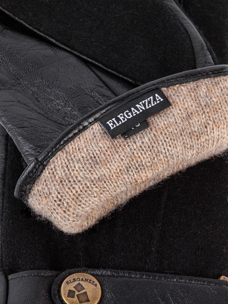 Перчатки мужские торговой марки ELEGANZZA производства Китай. Модель выполнена из натуральной кожи ягненка и трикотажа, состав которого 80% кашемир, 20% шерсть. Подкладка: 100% шерсть. На манжете ремешок для регулировки ширины перчатки на металлической кнопке. Данная модель позволяет работать с сенсорным экраном в перчатках. Длина манжеты от нижней точки большого пальца до края перчаток - 7 см. Длина пальцев - средняя.