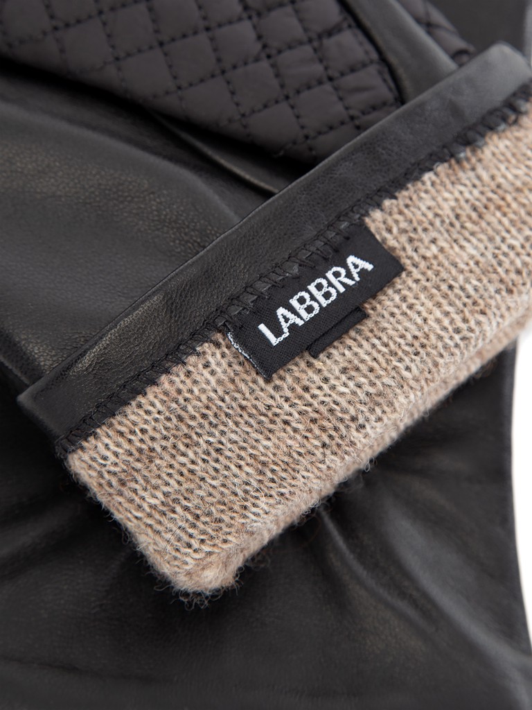 Перчатки торговой марки LABBRA из натуральной кожи ягненка. Производитель Китай. Подкладка: 70% шерсть, 30% акрил. Отделка - лицевая сторона выполнена из 100% полиэстера с симметричными декоративными строчками. Длина манжеты от нижней точки большого пальца до края перчаток - 6.5 см. Длина пальцев - средняя.