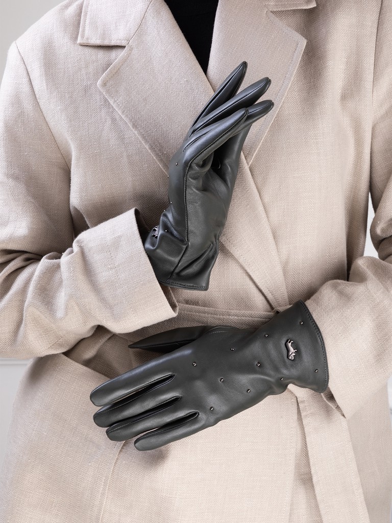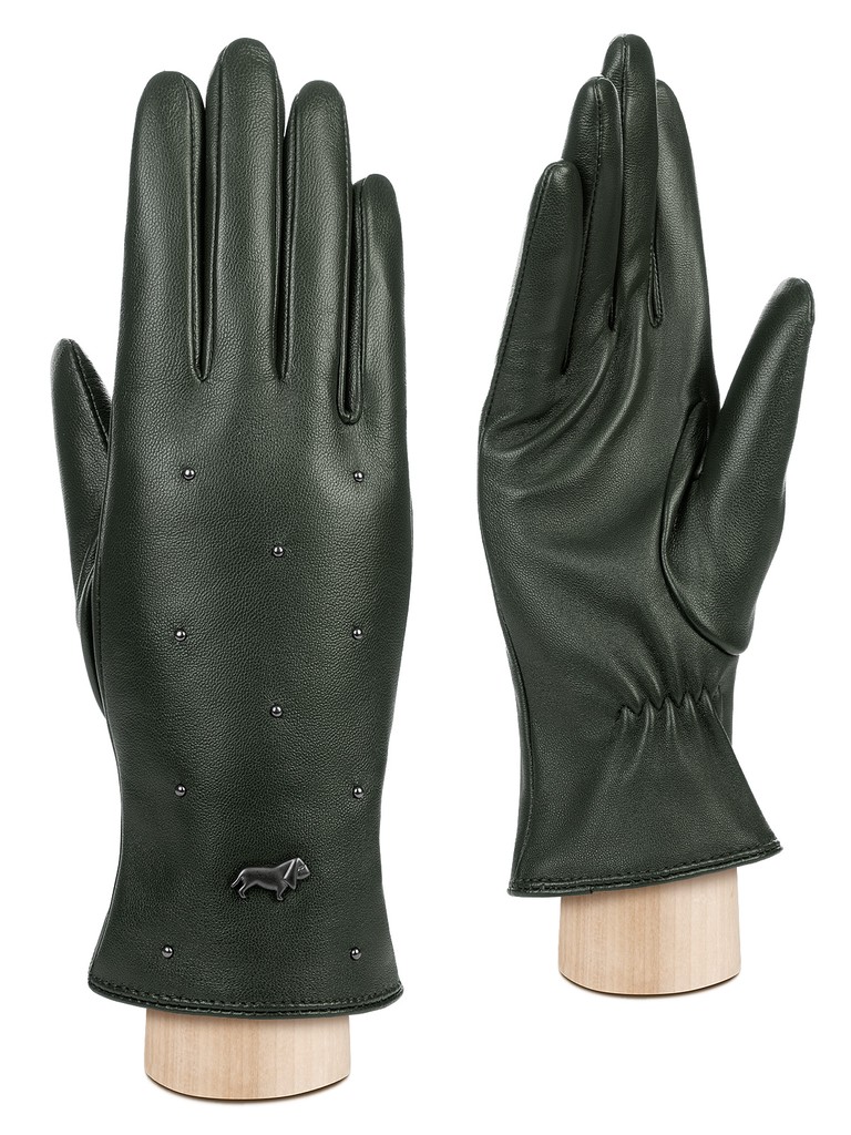 Перчатки женские торговой марки LABBRA из натуральной кожи ягненка. Производитель Китай. Подкладка: 70% шерсть, 30% акрил. Отделка - металлические хольнитены на лицевой части и фирменная фурнитура LABBRA. Длина манжеты от нижней точки большого пальца до края перчаток - 5,5 см. Длина пальцев - средняя.