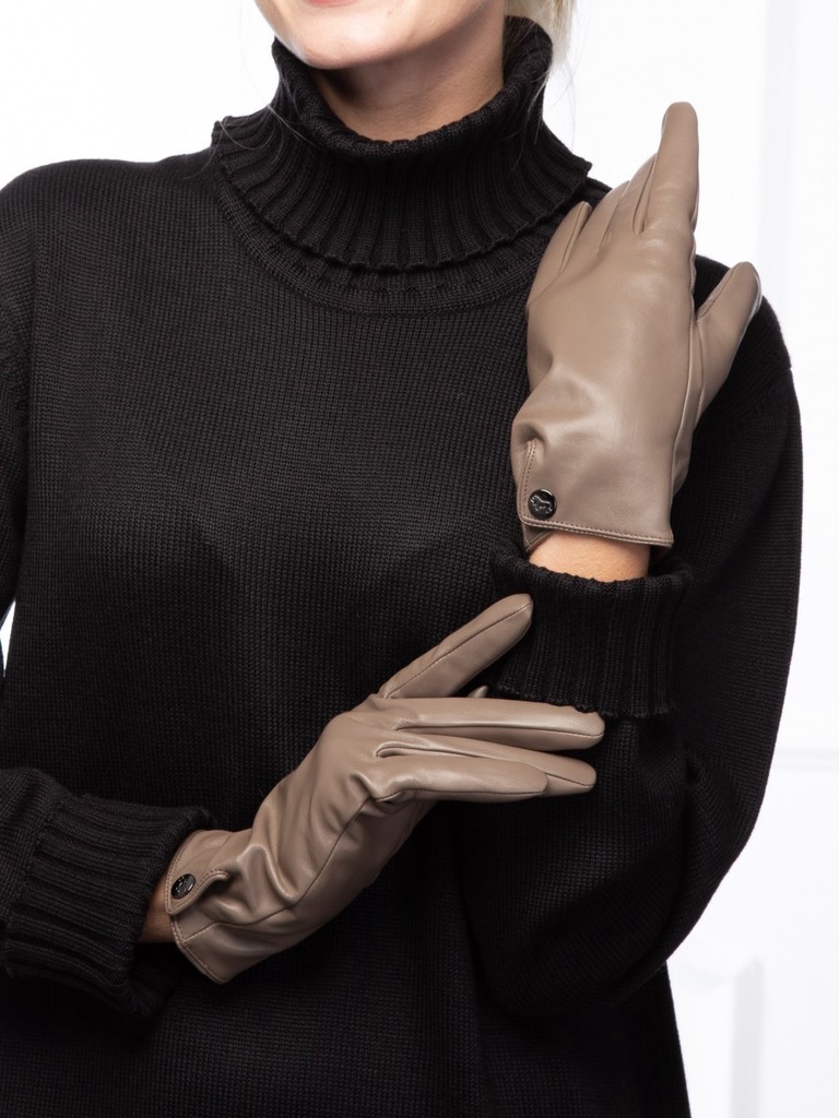 Перчатки женские торговой марки LABBRA из натуральной кожи ягненка. Производство Китай. Подкладка: 70% шерсть + 30% акрил. Отделка - на лицевой части перчатки разрез с фирменной кнопкой. Длина манжеты от нижней точки большого пальца до края перчаток - 6 см. Длина пальцев - средняя.