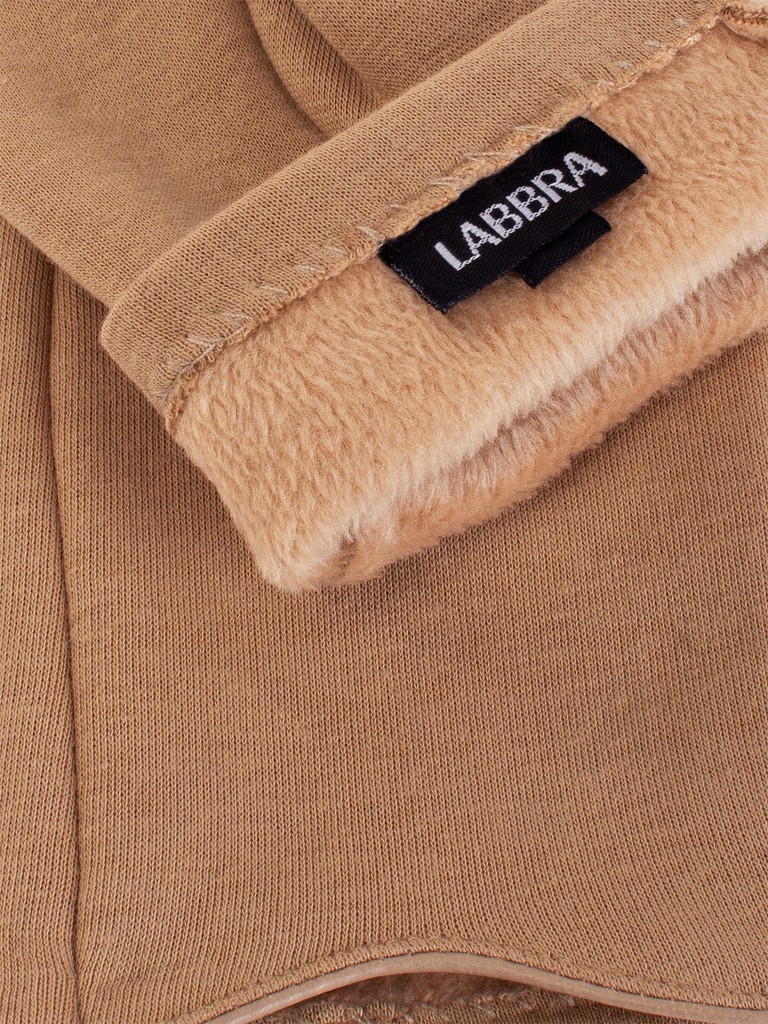 Перчатки женские торговой марки LABBRA производства Китай выполнены из трикотажа. Состав трикотажа: 50% хлопок, 50% полиэстер. Отделка края манжеты по всему периметру с использованием экокожи. Длина манжеты от нижней точки большого пальца до края перчатки - 7 см. Длина пальцев - средняя. Модель перчатки универсального размера, подойдёт на любую полноту руки благодаря хорошему стрейчу и эластичности трикотажа.