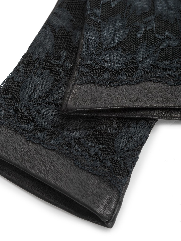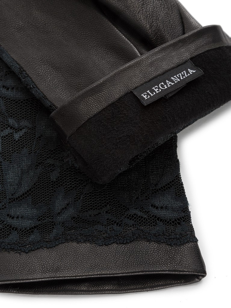 Митенки женские торговой марки ELEGANZZA. Ладонная часть выполнена из натуральной кожи ягненка производства Италии, лицевая часть: из гипюра. Без подкладки. Длина манжеты от нижней точки большого пальца до края перчаток - 6 см.