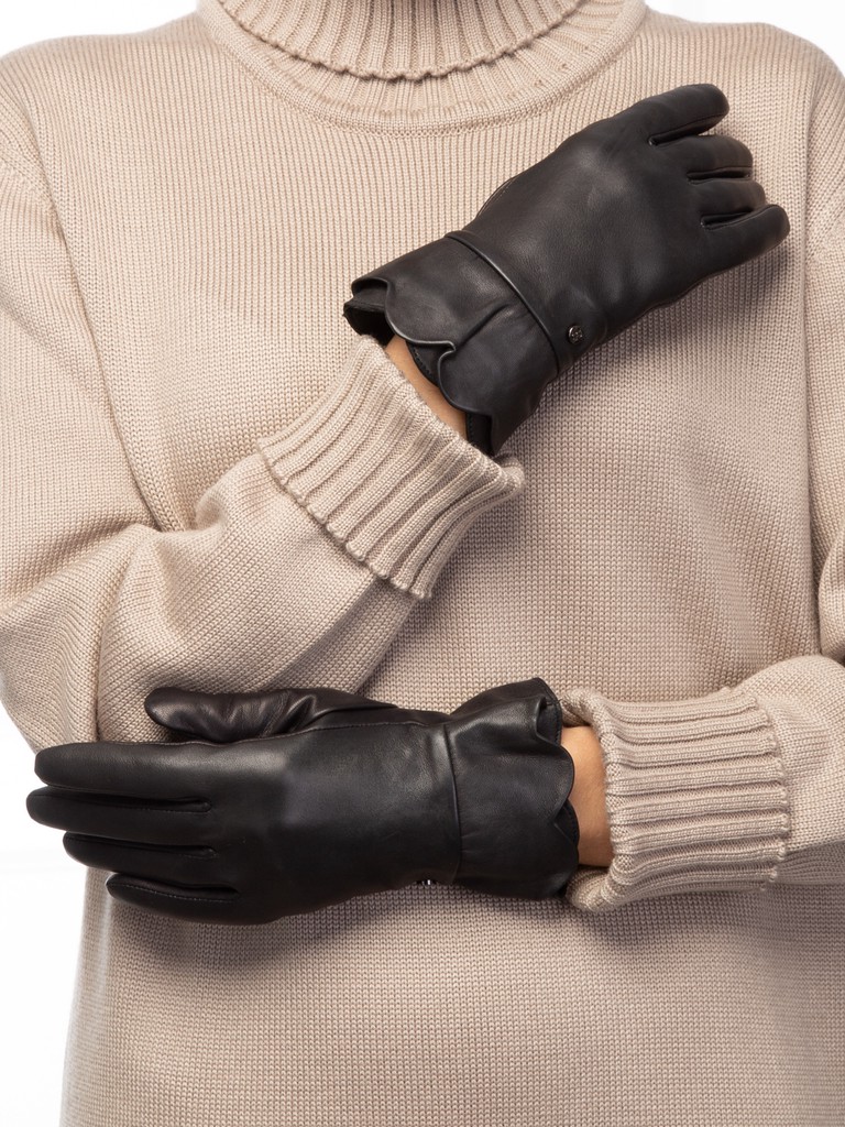 Перчатки торговой марки ELEGANZZA производства Китай выполнены из натуральной кожи ягненка. Подкладка: 70% шерсть + 30% кашемир. Отделка - декоративные лепестки из лоскутов кожи по манжету, а также фурнитура с фирменной символикой. Длина манжеты от нижней точки большого пальца до края перчаток - 5 см. Длина пальцев - укороченные.