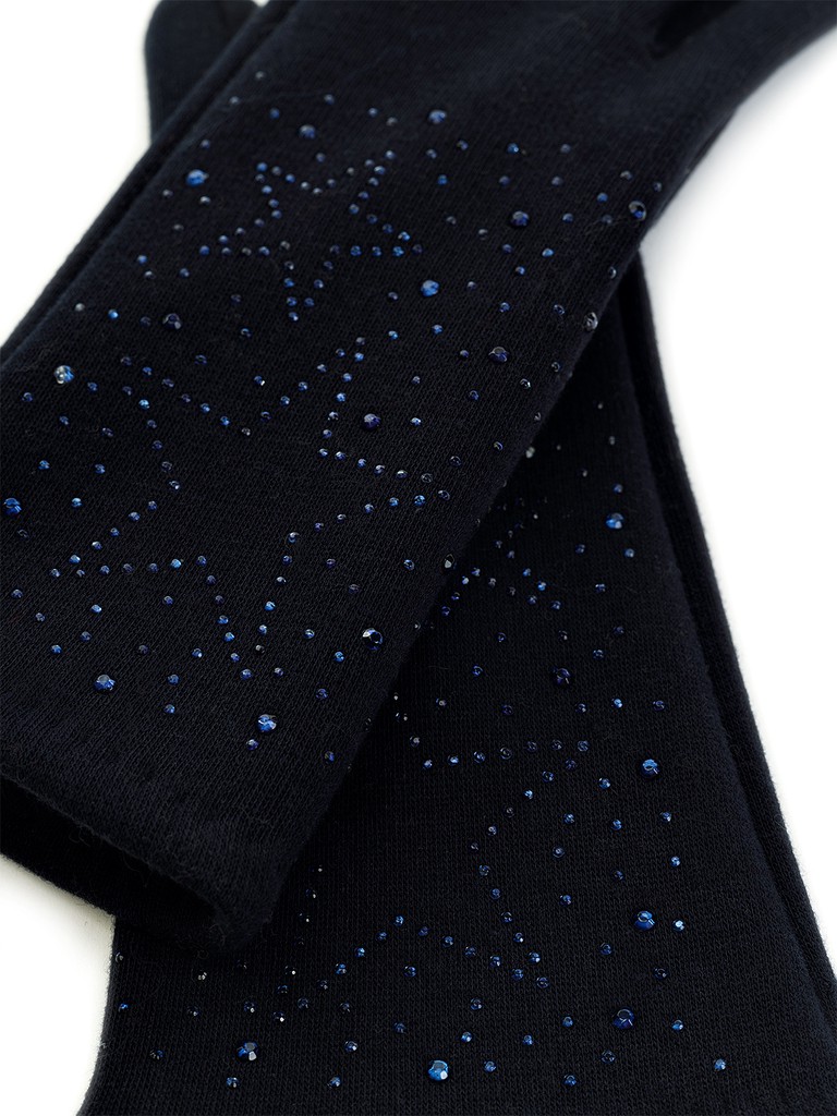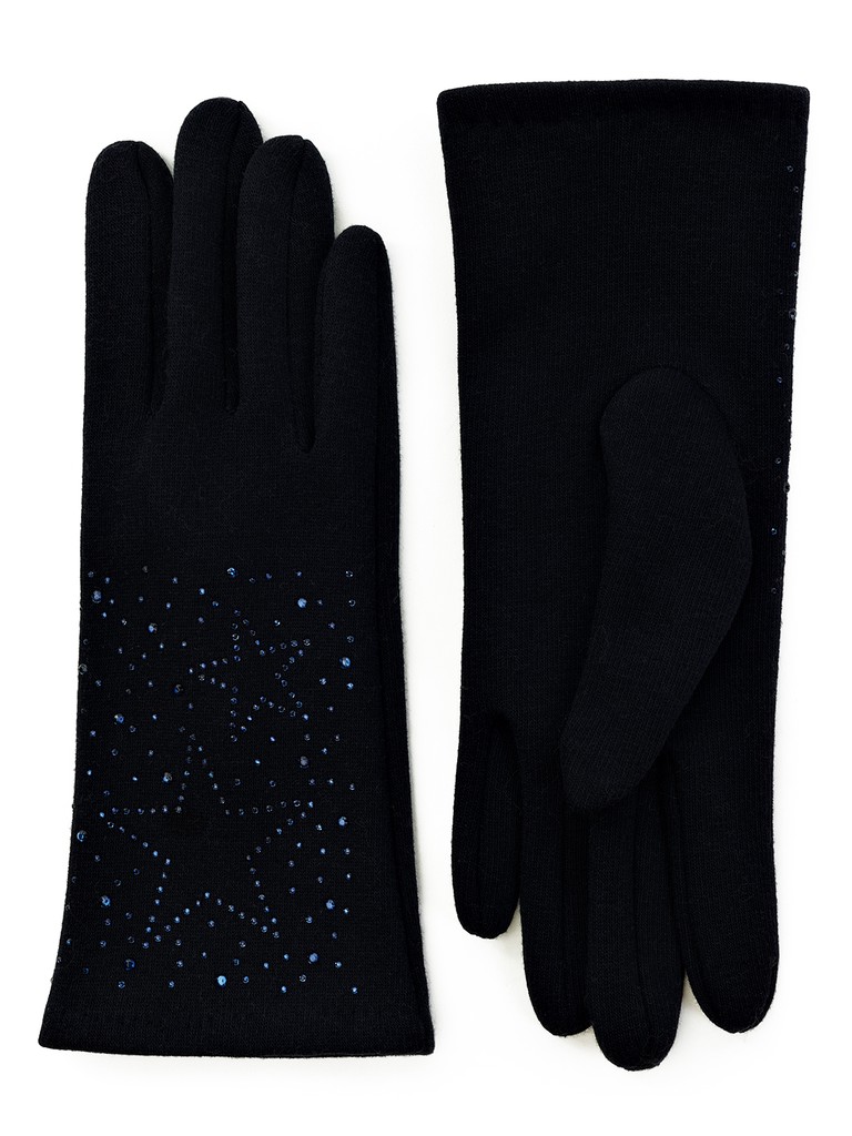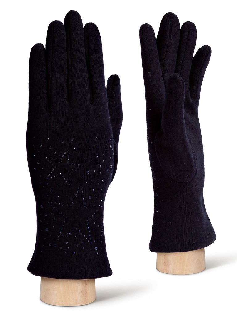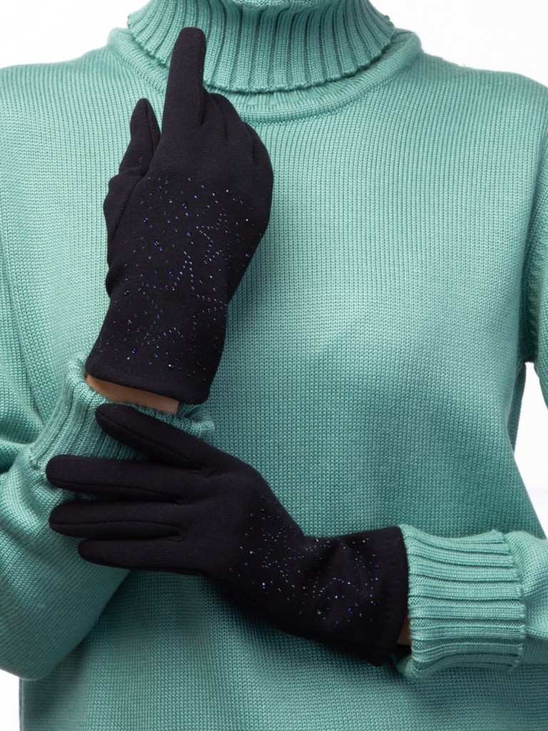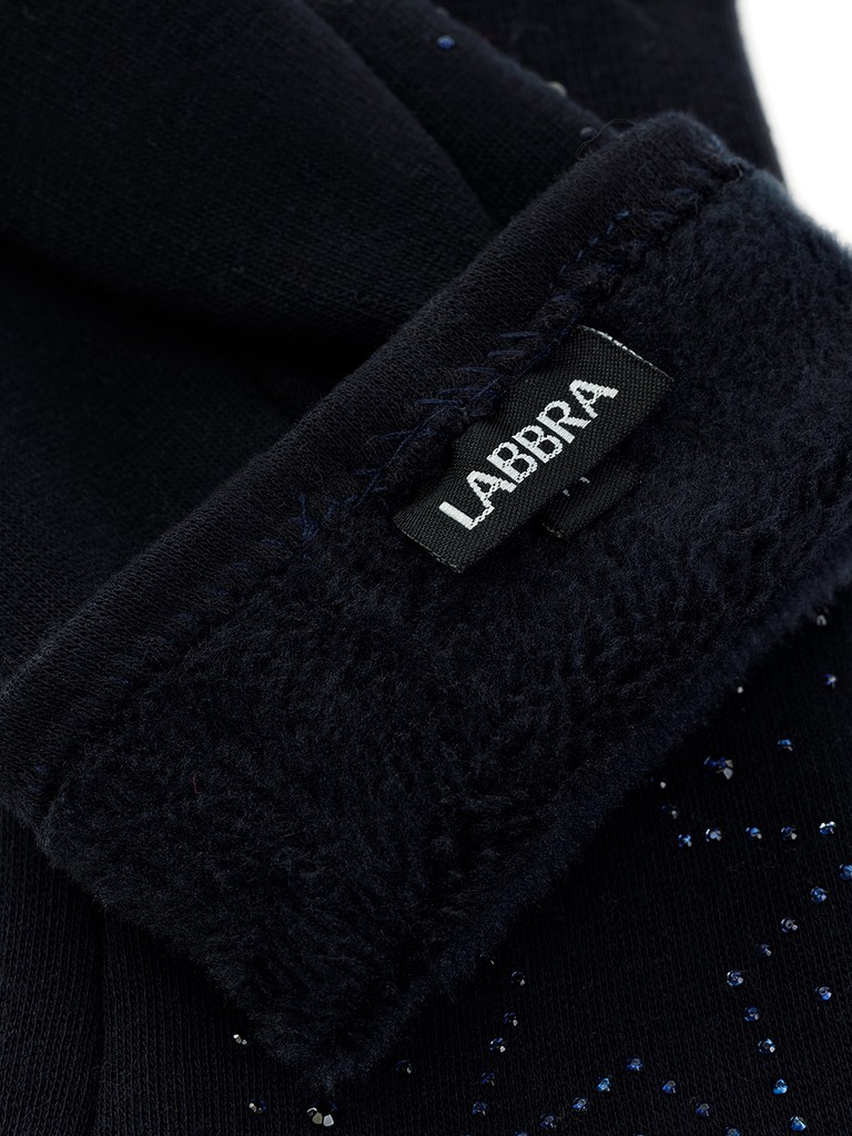 Перчатки женские торговой марки LABBRA производства Китай выполнены из трикотажа. Состав трикотажа: 50% хлопок, 50% полиэстер. Отделка - россыпь мелких страз в тон перчатки, выполненные рисунком звездами. Длина манжеты от нижней точки большого пальца до края перчатки - 6.5 см. Длина пальцев - средняя. Модель перчатки универсального размера, подойдёт на любую полноту руки благодаря хорошему стрейчу и эластичности трикотажа.