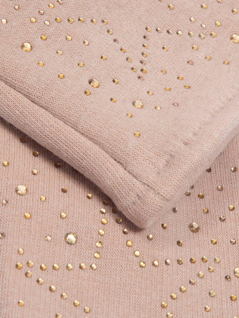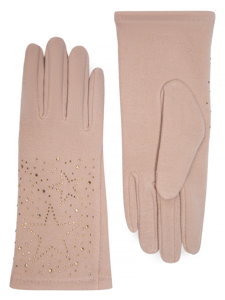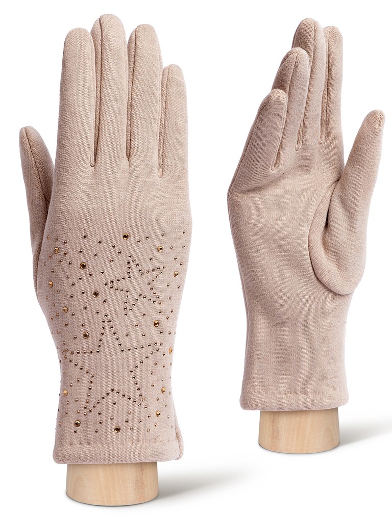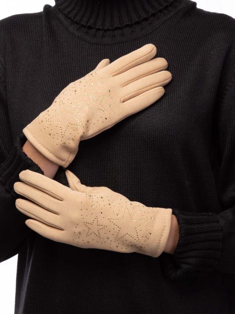 Перчатки женские торговой марки LABBRA производства Китай выполнены из трикотажа. Состав трикотажа: 50% хлопок, 50% полиэстер. Отделка - россыпь мелких страз в тон перчатки, выполненные рисунком звездами. Длина манжеты от нижней точки большого пальца до края перчатки - 6.5 см. Длина пальцев - средняя. Модель перчатки универсального размера, подойдёт на любую полноту руки благодаря хорошему стрейчу и эластичности трикотажа.