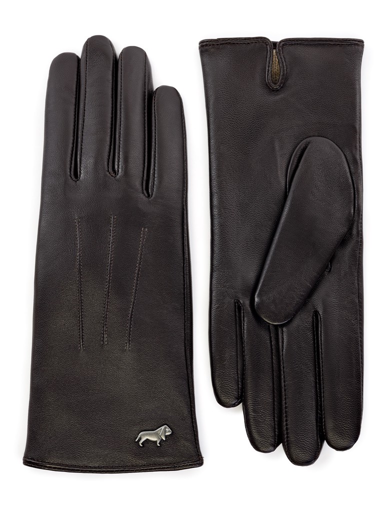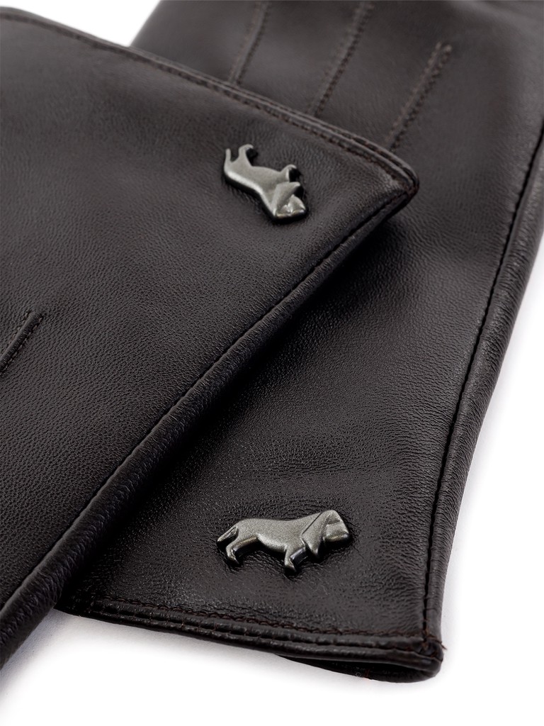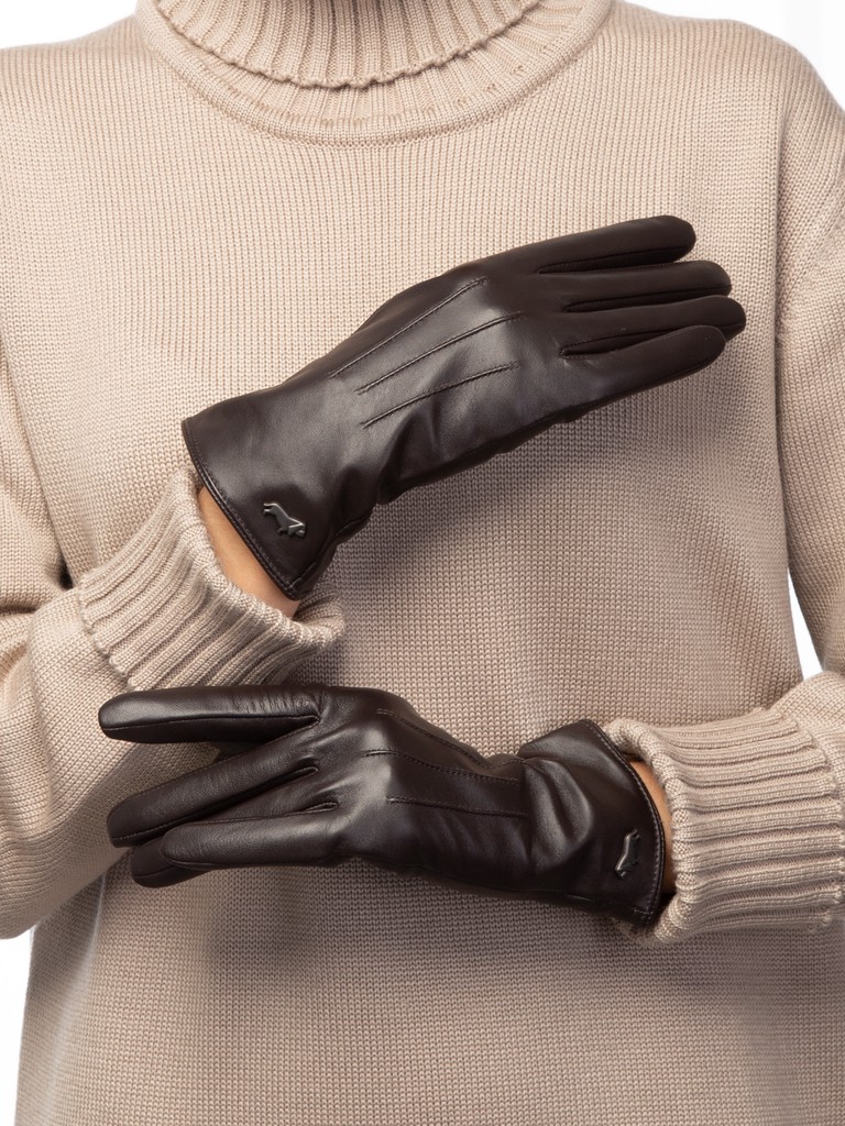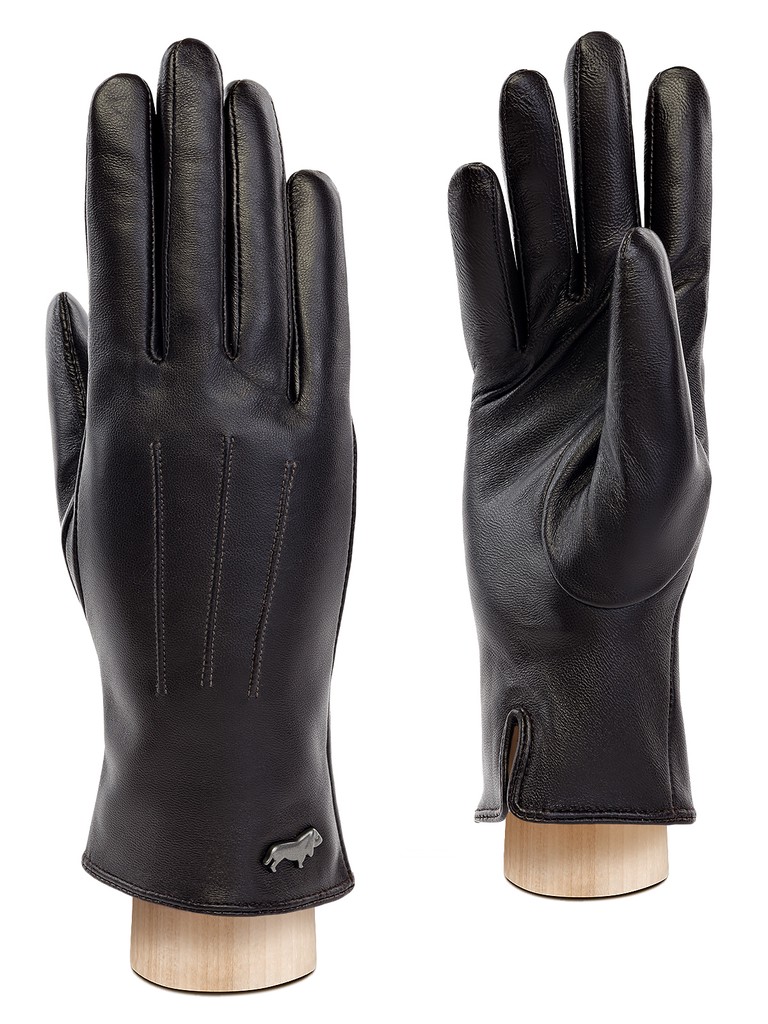 Перчатки торговой марки LABBRA из натуральной кожи ягненка. Производитель Китай. Подкладка: 70% шерсть, 30% акрил. Отделка - машинная строчка "три луча", фирменная фурнитура в виде собачки. Длина манжеты от нижней точки большого пальца до края перчаток - 6 см. Длина пальцев - средняя.