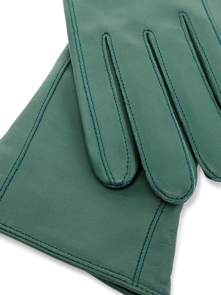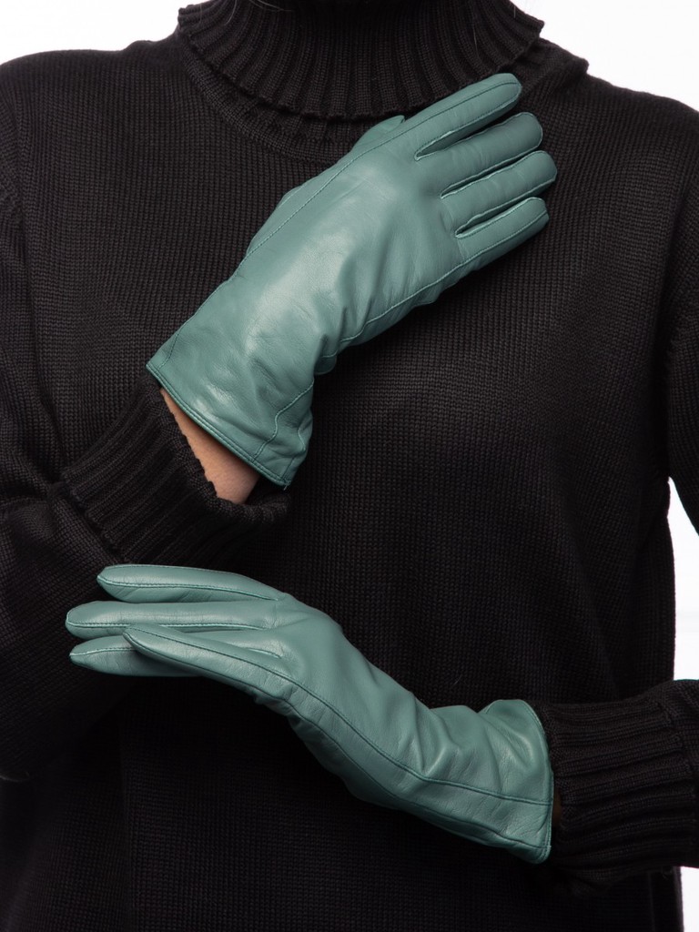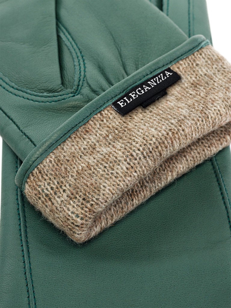 Перчатки женские торговой марки ELEGANZZA производства Италии, выполнены из натуральной кожи ягнёнка. Подкладка: 85% шерсть, 15% кашемир. Отделка - декоративные швы от нижнего края перчатки и до кончиков мизинца и указательного пальцев. Нижний край перчатки окантован. Резинка на ладонной стороне. Длина манжеты от нижней точки большого пальца до края перчаток - 8 см. Длина пальцев - средняя.