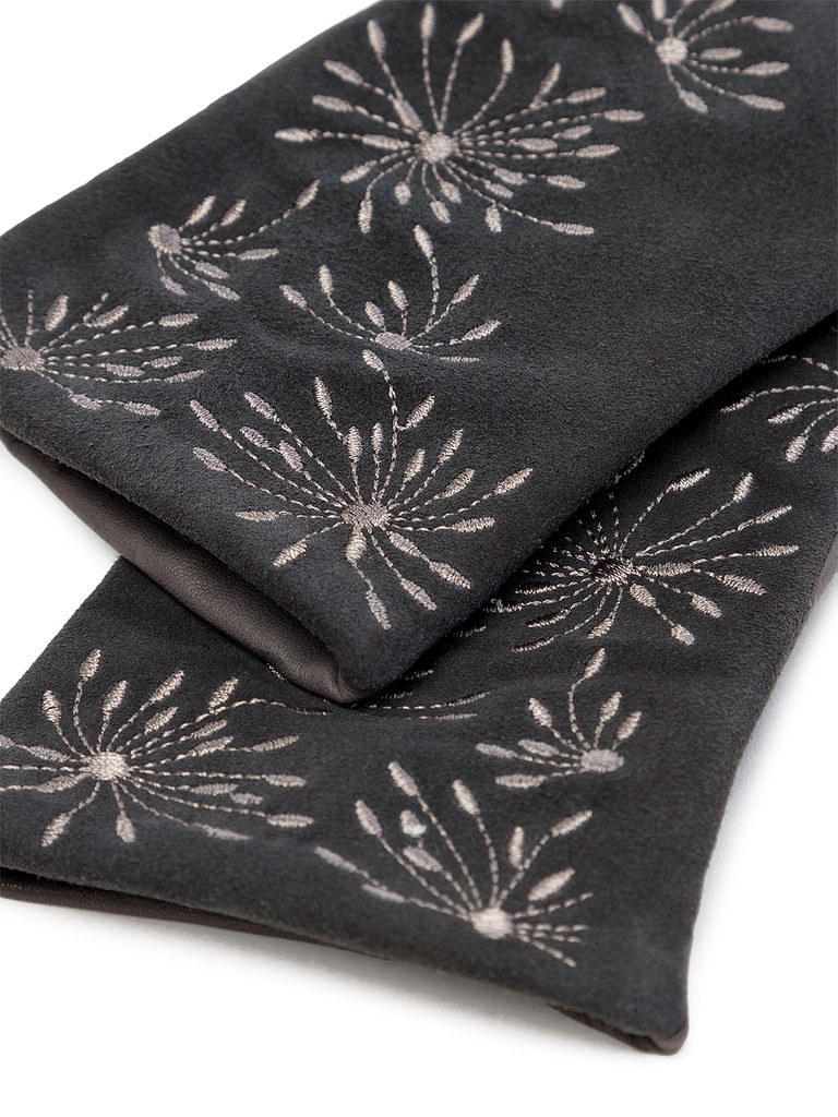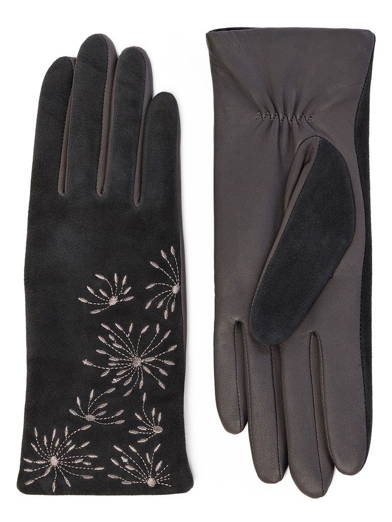 Перчатки женские торговой марки ELEGANZZA из натуральной итальянской кожи ягненка и натурального велюра на лицевой части. Подкладка: 85% шерсть + 15% кашемир. Отделка - декоративная вышивка в цветочной тематике. Длина манжеты от нижней точки большого пальца до края перчаток - 6,5 см. Длина пальцев - средняя.