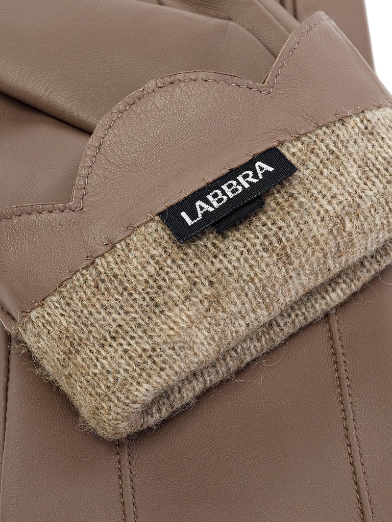 Перчатки торговой марки LABBRA из натуральной кожи ягненка. Производитель Китай. Подкладка: 70% шерсть, 30% акрил. Отделка - симметричная отстрочка на лицевой стороне, фигурная линия манжеты декорированная фирменной фурнитурой. Длина манжеты от нижней точки большого пальца до края перчаток - 5.5 см. Длина пальцев - укороченные.
