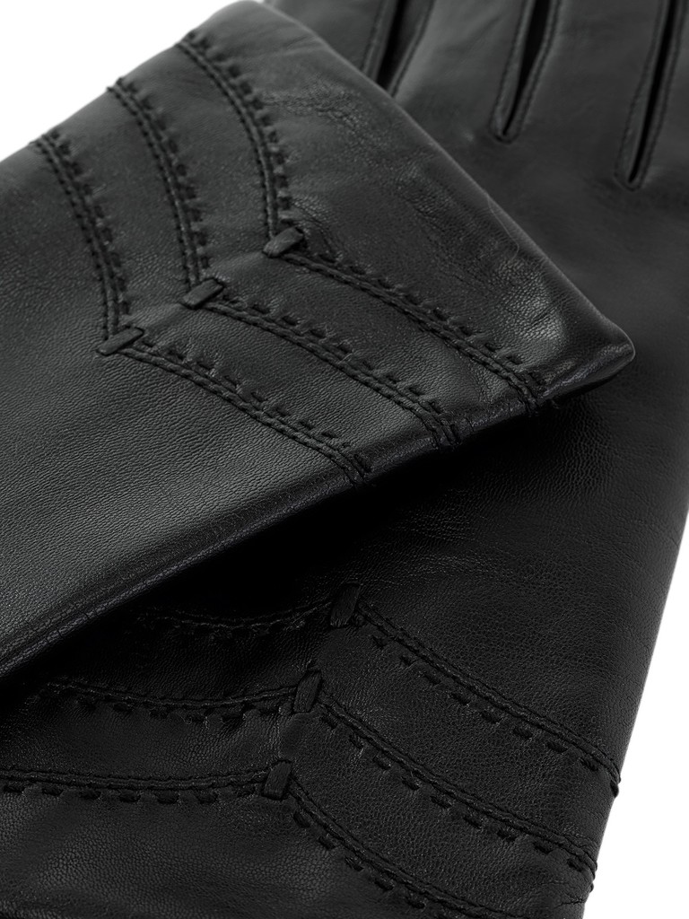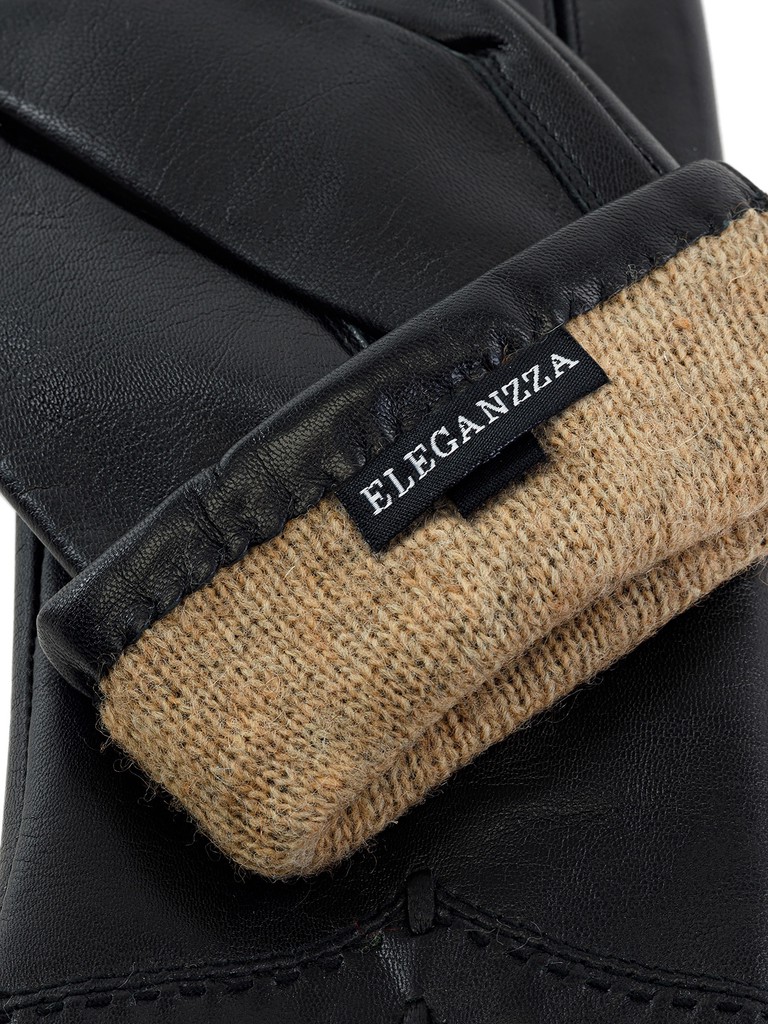 Перчатки торговой марки ELEGANZZA производства Китай выполнены из натуральной кожи ягнёнка. Подкладка: 100% шерсть. Отделка - декоративная отстрочка V-образной формы по линии манжета, украшена продежками из тонкго кожаного шнурка. Длина манжеты от нижней точки большого пальца до края перчаток - 5,5 см. Длина пальцев - средняя.