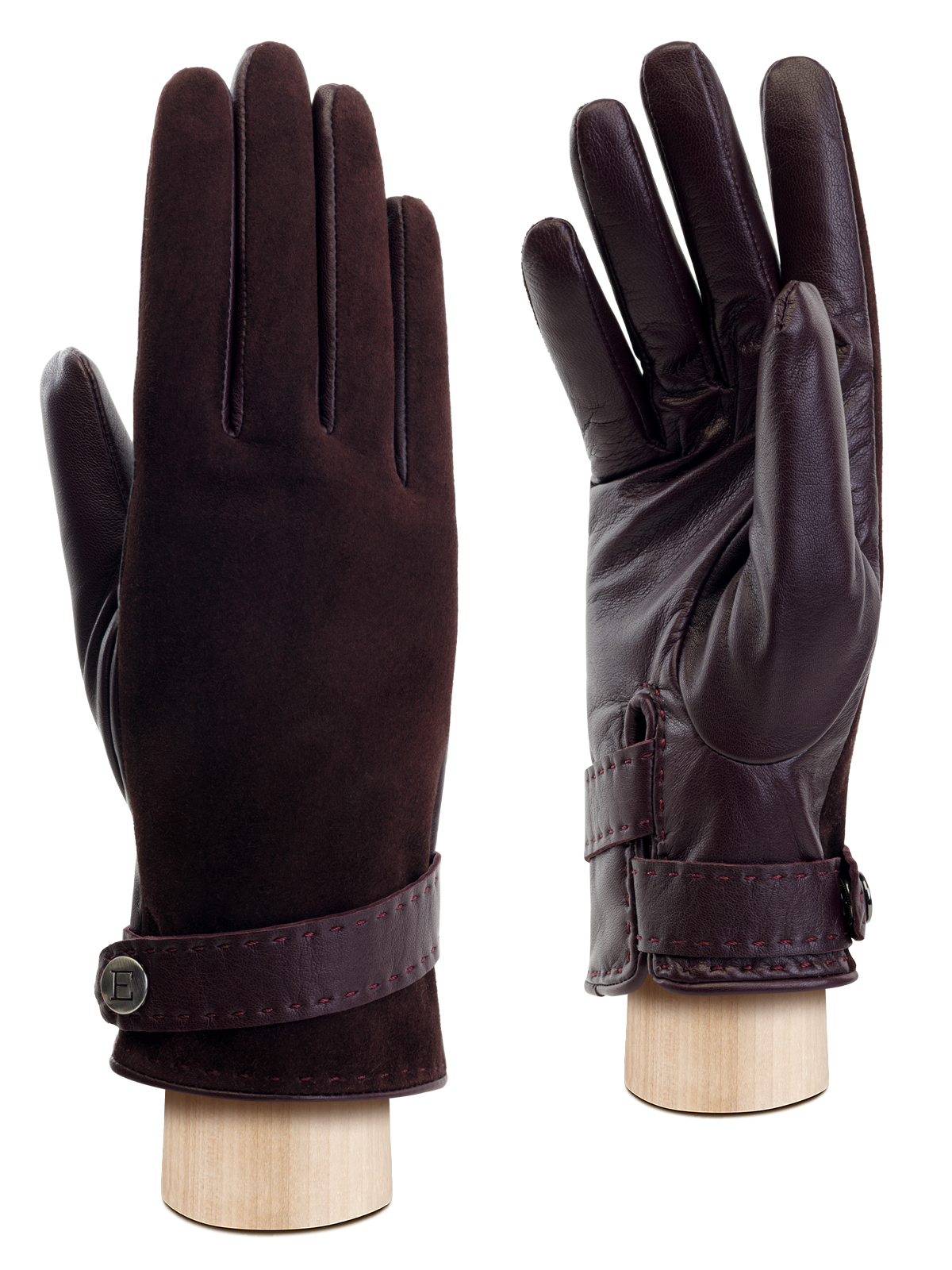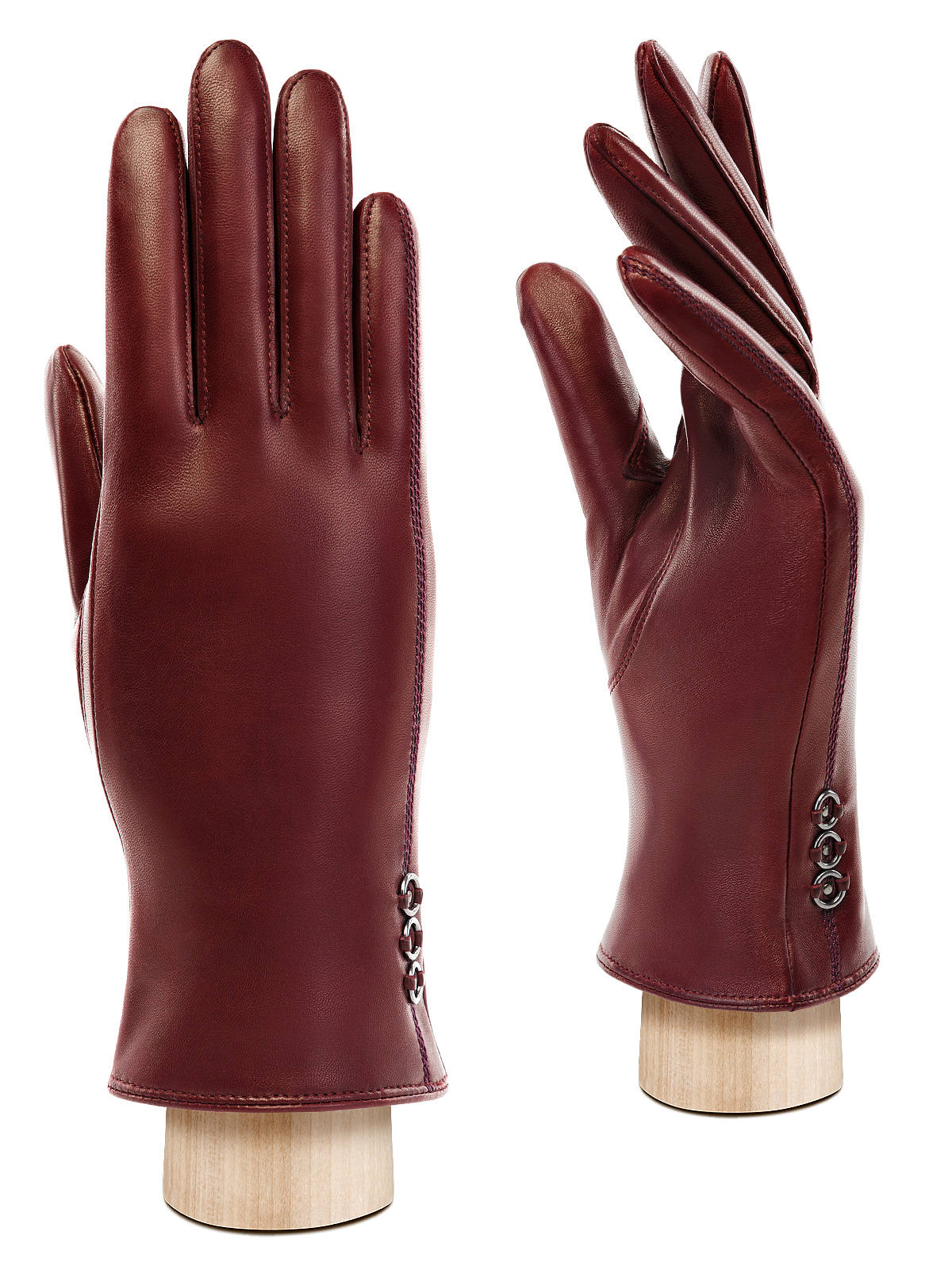 Перчатки женские торговой марки ELEGANZZA из натуральной кожи ягненка производства Италии. Подкладка: 85% шерсти, 15% кашемира. Декоративные строчки на лицевой стороне со стороны мизинца; декорированная фурнитура в виде колец, украшенная хольнитенами. Длина манжеты от нижней точки большого пальца до края перчаток составляет - 4,5 см. Пальцы укороченные.