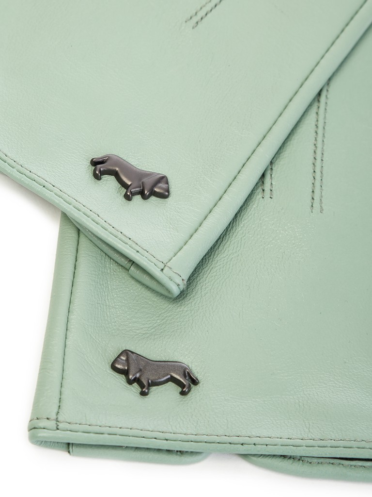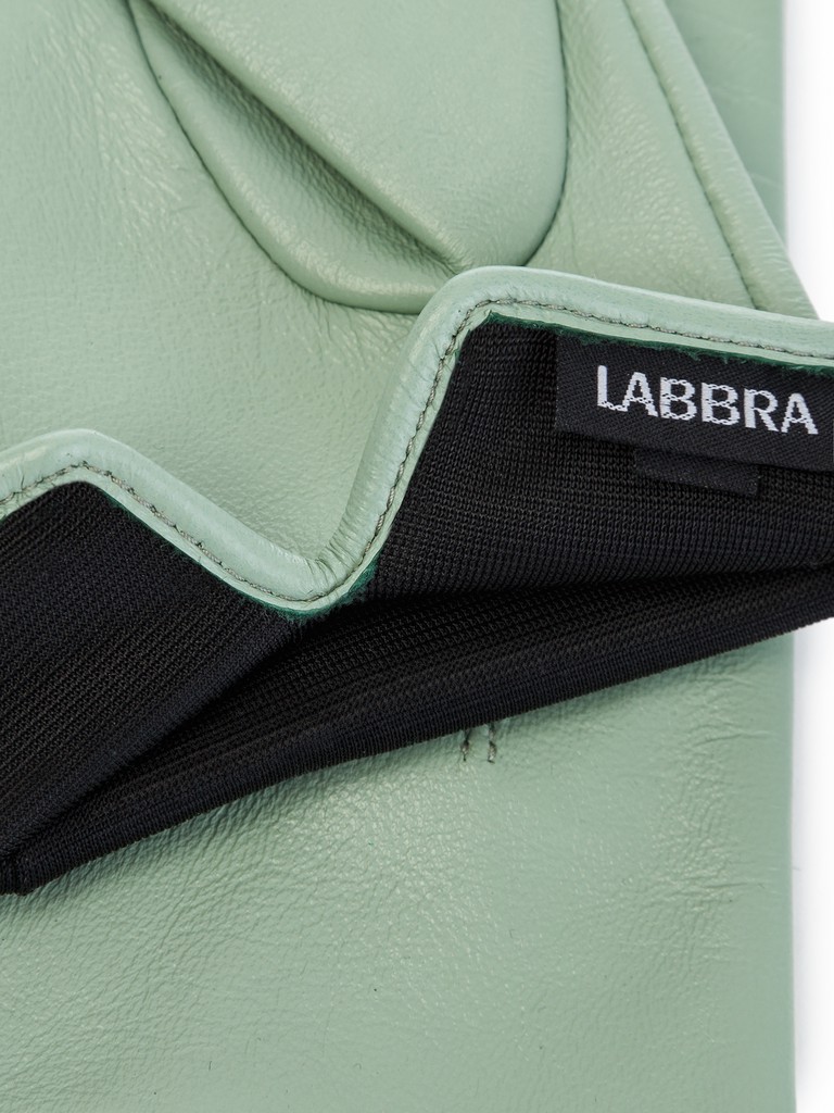Перчатки торговой марки LABBRA из натуральной кожи ягненка. Производитель Китай. Подкладка: шелк. Отделка - машинная строчка "три луча", фирменная фурнитура в виде собачки. Длина манжеты от нижней точки большого пальца до края перчаток - 6 см. Длина пальцев - средняя.