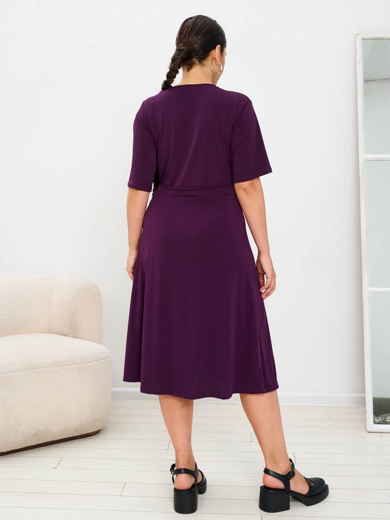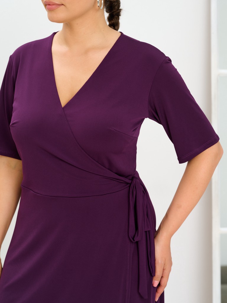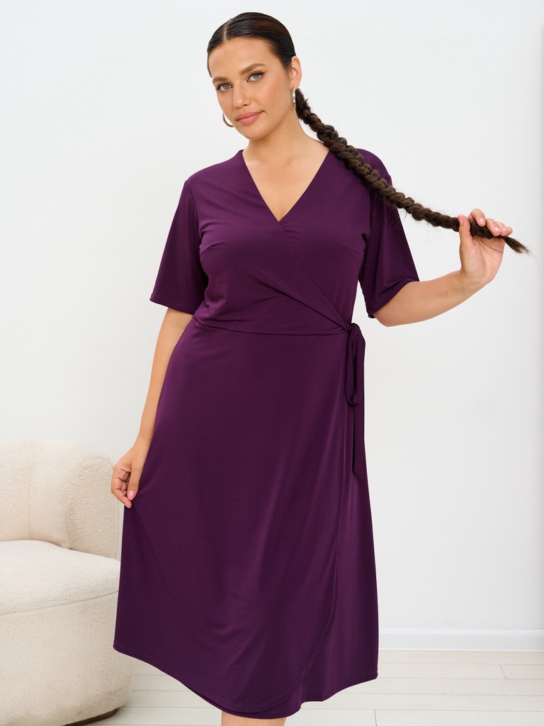 Женское платье отрезное по линии талии с расклешённой юбкой. Платье произведено из полотна "масло" - очень комфортное, легкое, долговечно в носке, не мнется и очень приятно струится по фигуре. За счет грамотной прибавке на свободу облегания, одежда не обтягивает проблемные зоны, но при этом создает фигуре женственные формы. Втачной свободный рукав длиной до локтя, позволяет использовать данную модель молодой девушке и женщинам старшего возраста. Длина изделия - ниже колена. Юбка имеет фальш запах (при эксплуатации не открываются коленки). По линии талии имеется притаченный пояс, позволяющий создать красивый женственный мягкий бант сбоку. Горловина оформлена достаточно глубоким V-образным вырезом, позволяющим зрительно вытянуть зону декольте и удлинить даже самую короткую шею. Линии запаха подвижны и возможно его уменьшение, за счет более глубокого нахлёста, что дает отличную посадку на корпулентные фигуры.