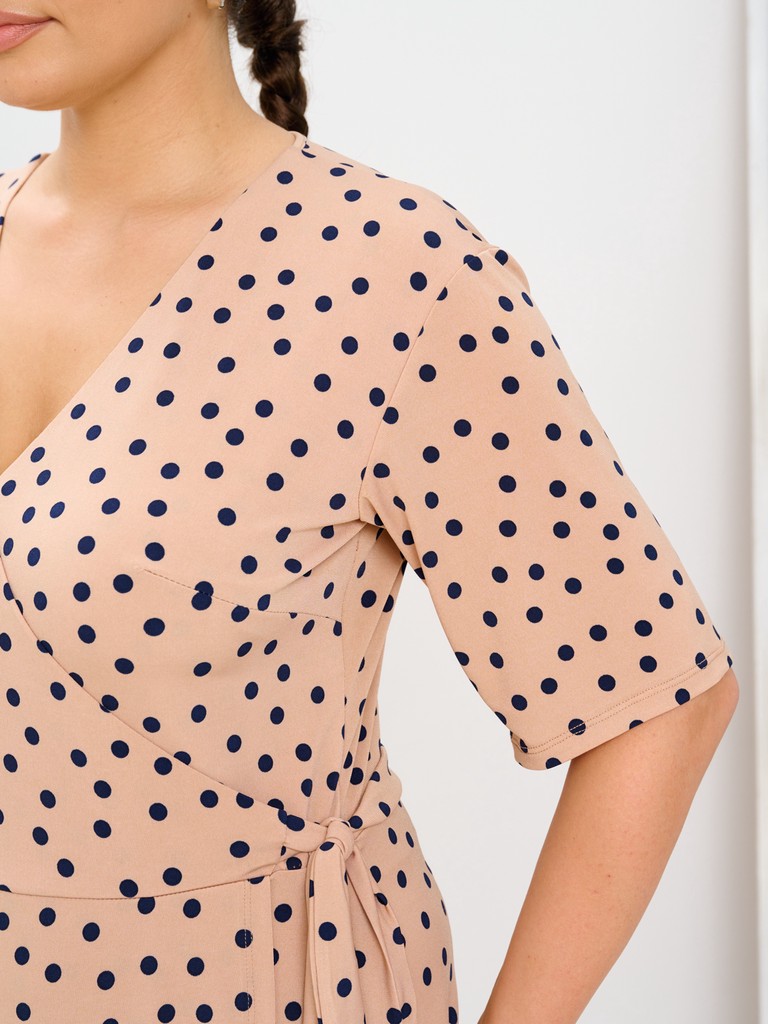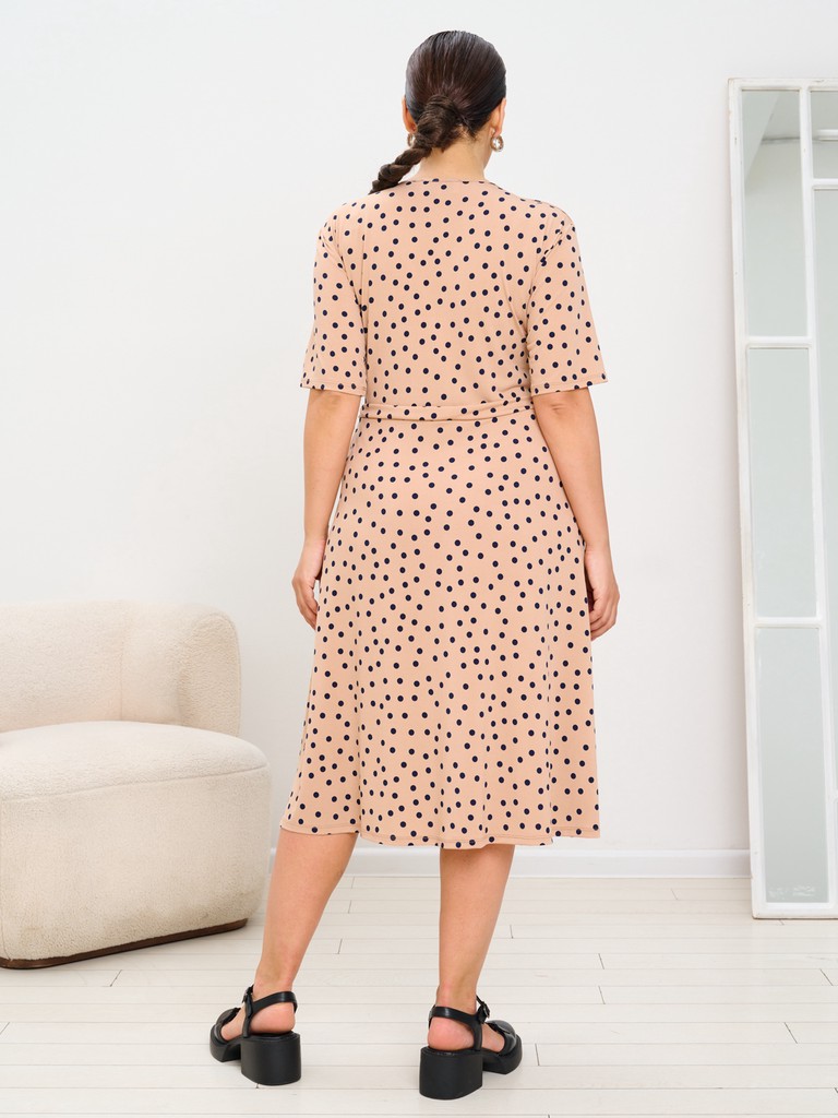 Женское платье отрезное по линии талии с расклешённой юбкой. Платье произведено из полотна "масло" - очень комфортное, легкое, долговечно в носке, не мнется и очень приятно струится по фигуре. За счет грамотной прибавке на свободу облегания, одежда не обтягивает проблемные зоны, но при этом создает фигуре женственные формы. Втачной свободный рукав длиной до локтя, позволяет использовать данную модель молодой девушке и женщинам старшего возраста. Длина изделия - ниже колена. Юбка имеет фальш запах (при эксплуатации не открываются коленки). По линии талии имеется притаченный пояс, позволяющий создать красивый женственный мягкий бант сбоку. Горловина оформлена достаточно глубоким V-образным вырезом, позволяющим зрительно вытянуть зону декольте и удлинить даже самую короткую шею. Линии запаха подвижны и возможно его уменьшение, за счет более глубокого нахлёста, что дает отличную посадку на корпулентные фигуры.