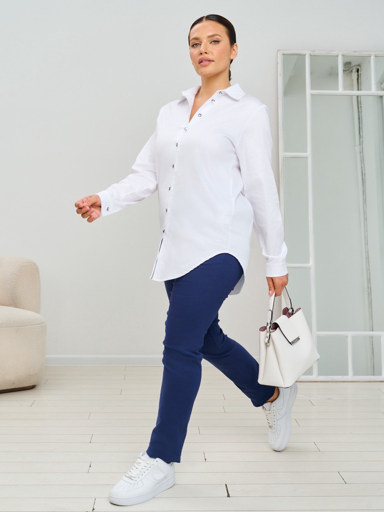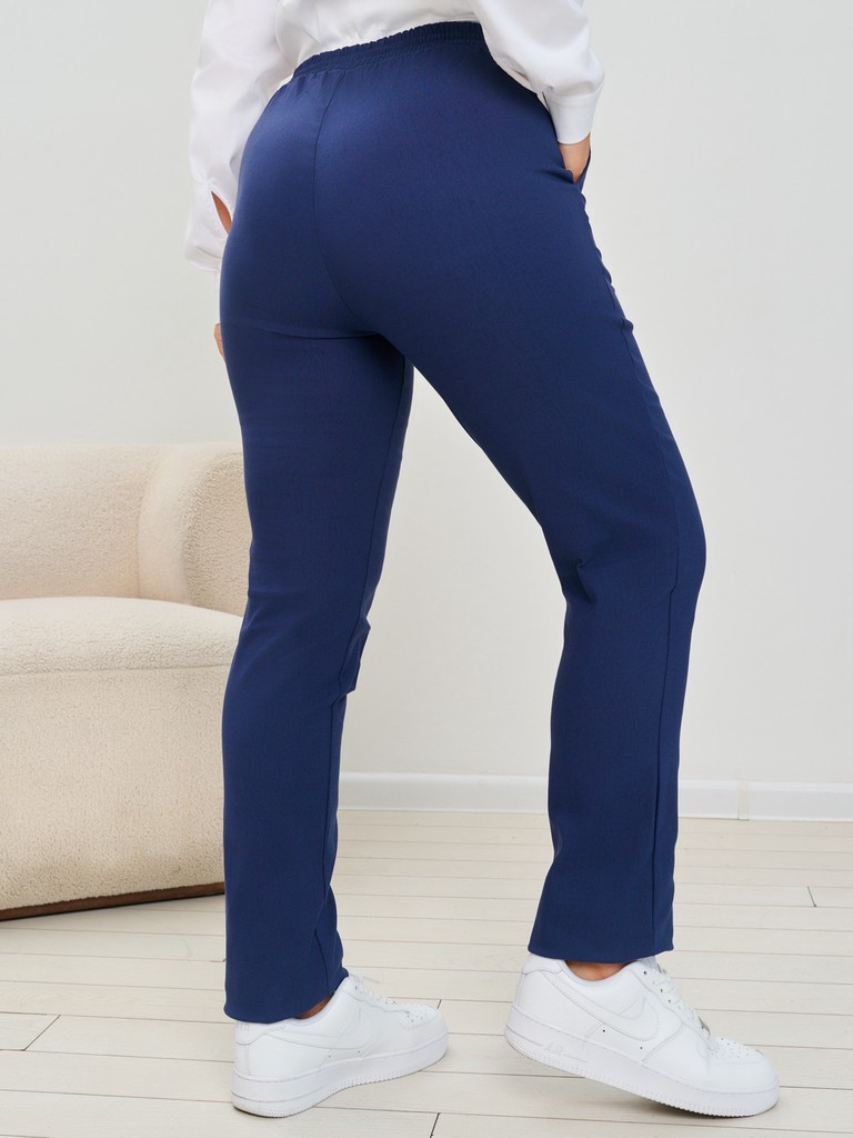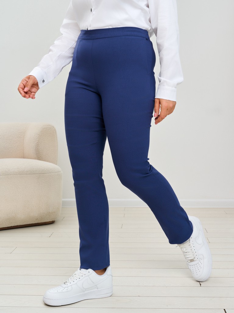 Брюки женские больших размеров зауженные к низу. Брюки очень комфортны при эксплуатации - полотно очень прекрасно подходит для использования в жаркие дни, оно очень хорошо тянется и не затруднит движения. Грамотно подобранная высота сидения придаст уверенности и обладательнице данных брюк. Эксплуатируемые карманы в боковых швах позволят не терять необходимые мелочи. Пояс оформлен таким образом, чтобы изделие было комфортно девушкам с любым типом фигуры - сзади широкая, удобная в использовании резинка. При этом если девушка любит заправлять блузки или другие плечевые изделия в брюки - для этого предусмотрено конструктивно передняя половинка брюк не имеет резинки и не собирается в области живота складками, тем самым не придает дополнительного объема там, где он не нужен. Зауженная к низу модель позволяет использовать эту модель брюк как с узкими футболками, так и с oversize туниками, создавая тем самым разные образы.