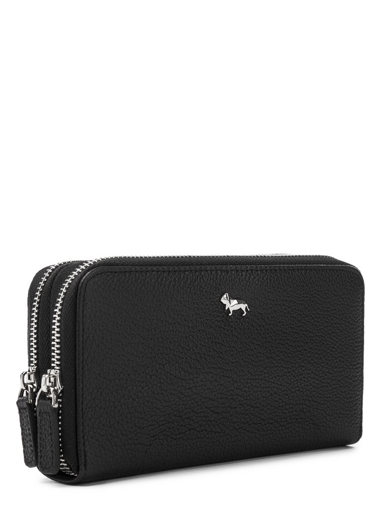 Женский кошелёк торговой марки LABBRA из натуральной кожи. Модель имеет два основных отделения, каждое из которых закрывается на круговую металлическую молнию. Внутри первого отделения - два не складывающихся отделения для купюр и два дополнительных плоских кармана для купюр, отделение для мелочи на дополнительной пластиковой молнии и 8 карманов для карт. Внутри второго отделения - 4 плоских не складывающихся кармана для купюр и 25 карманов для карт.
