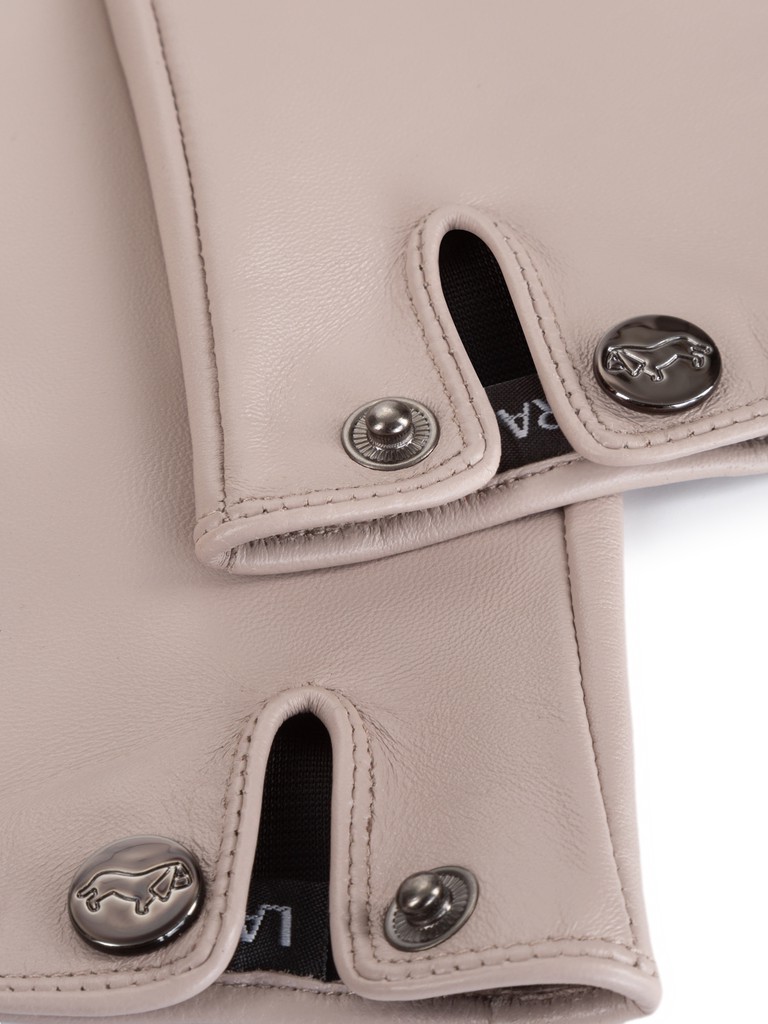 Перчатки женские торговой марки LABBRA из натуральной кожи ягненка. Производство Китай. Подкладка: шелк. Отделка - на лицевой части перчатки разрез с фирменной кнопкой. Длина манжеты от нижней точки большого пальца до края перчаток - 6.5 см. Длина пальцев - средняя.