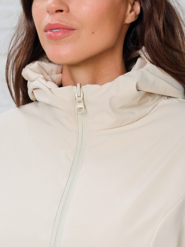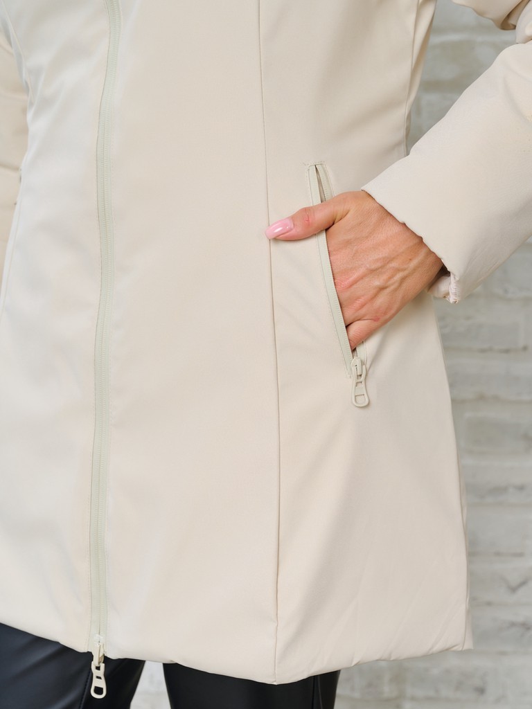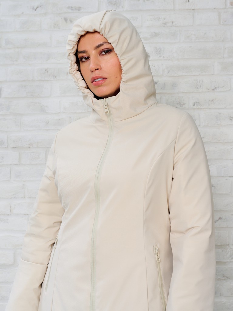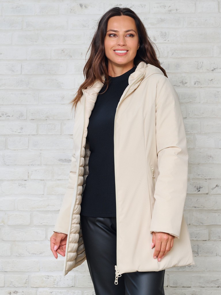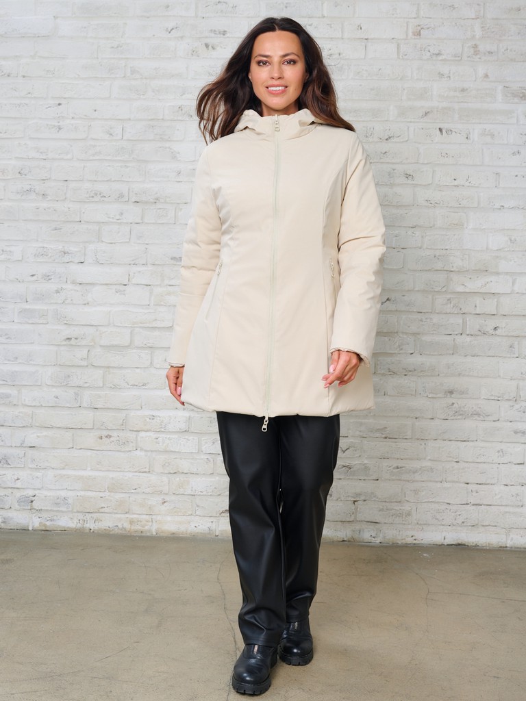 Куртка женская двусторонняя имеет рельефы с каждой из сторон, за счёт которых изделие имеет приталенный силуэт. Прорезные карманы на молнии (на каждой из сторон). Одна из сторон имеет горизонтальную стёжку, другая - имеет небольшой порог воздухо- и гидропроницаемости, с красивым матовым блеском. Куртка имеет капюшон с горловиной-стойка, позволяющий защитить шею от сильных весенних ветров.