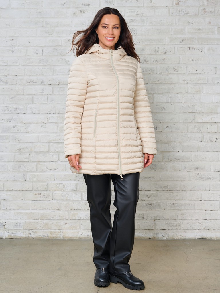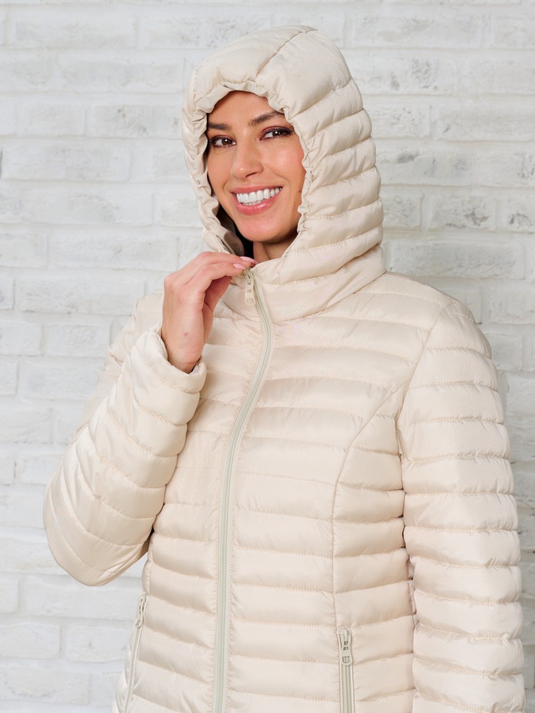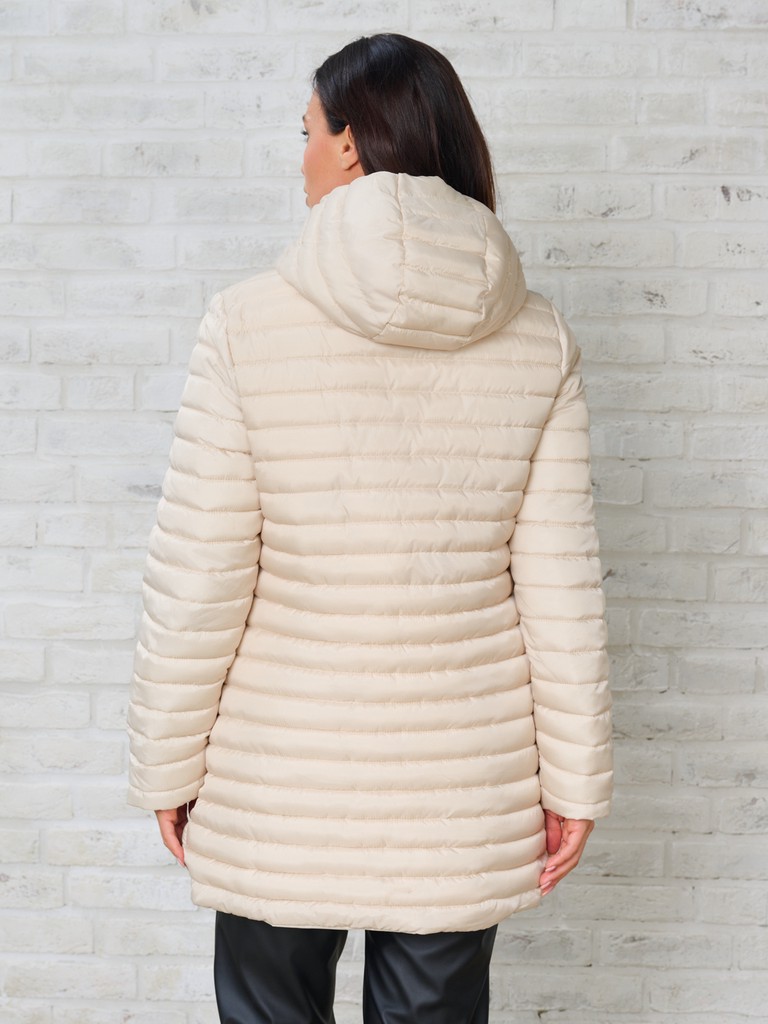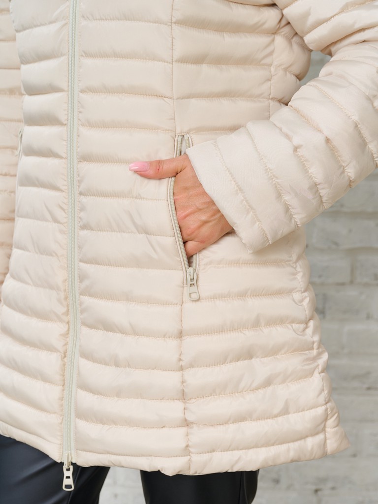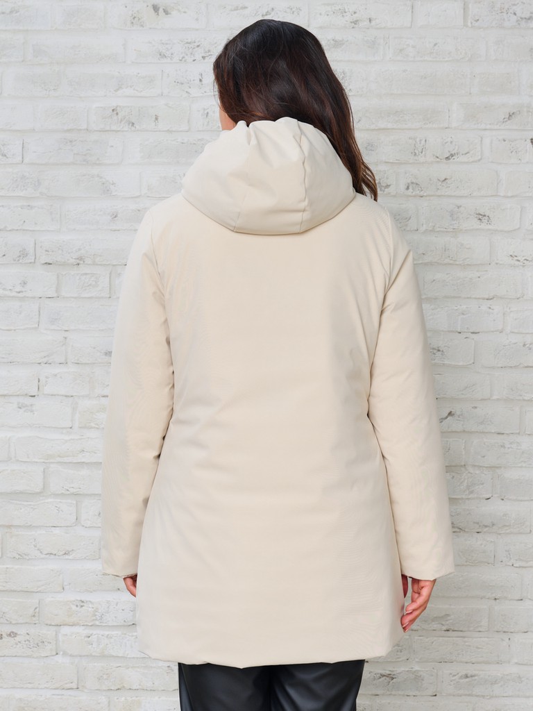 Куртка женская двусторонняя имеет рельефы с каждой из сторон, за счёт которых изделие имеет приталенный силуэт. Прорезные карманы на молнии (на каждой из сторон). Одна из сторон имеет горизонтальную стёжку, другая - имеет небольшой порог воздухо- и гидропроницаемости, с красивым матовым блеском. Куртка имеет капюшон с горловиной-стойка, позволяющий защитить шею от сильных весенних ветров.