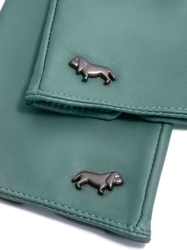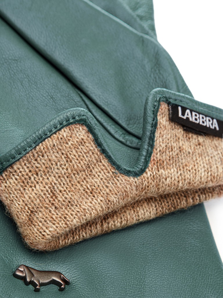 Перчатки торговой марки LABBRA из натуральной кожи ягненка. Производитель Китай. Подкладка: 70% шерсть, 30% акрил. Отделка - машинная строчка "три луча", фирменная фурнитура в виде собачки. Длина манжеты от нижней точки большого пальца до края перчаток - 6 см. Длина пальцев - средняя.