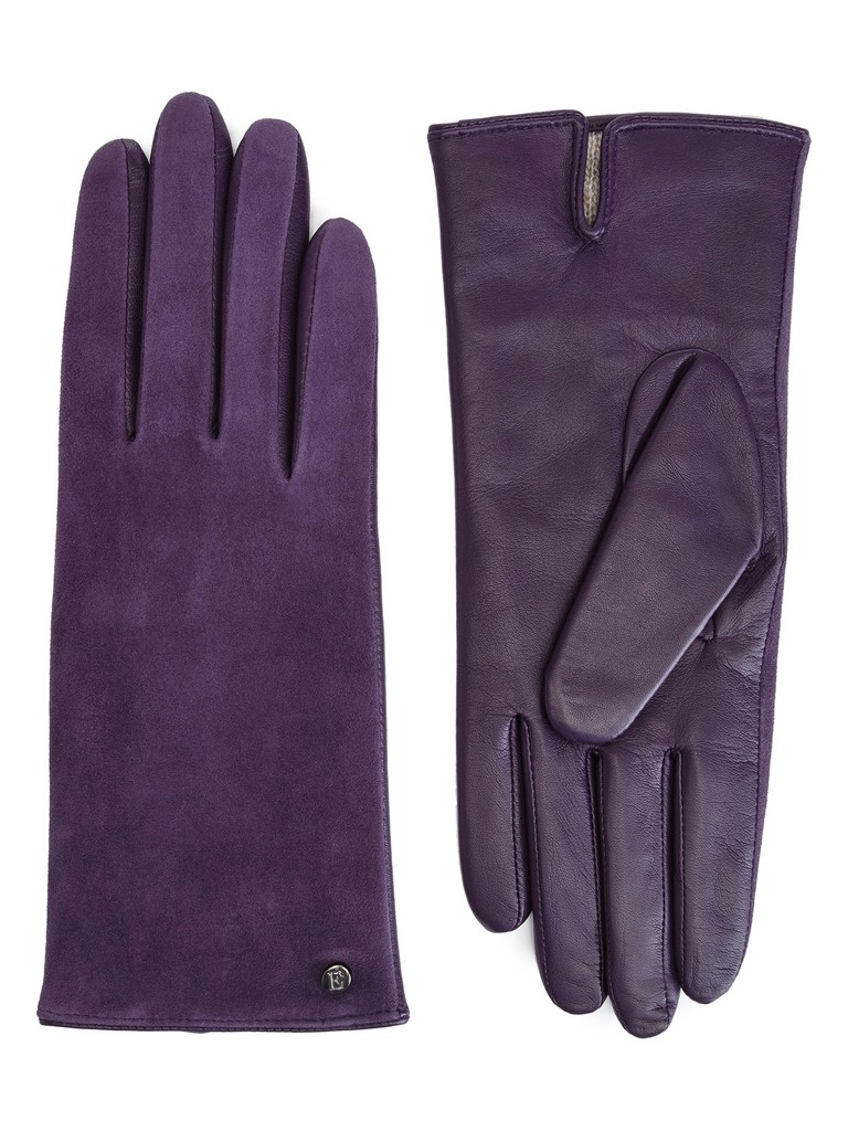 Перчатки женские торговой марки ELEGANZZA производства Китай изготовлены из натуральной кожи: верхняя часть - натуральный велюр, ладонная часть - натуральная кожа ягненка. Подкладка: 100% шерсть. Декоративная отделка - металлическая фурнитура с фирменной символикой. Длина манжета от нижней точки большого пальца до края перчаток составляет 6 см. Длина пальцев - средняя.
