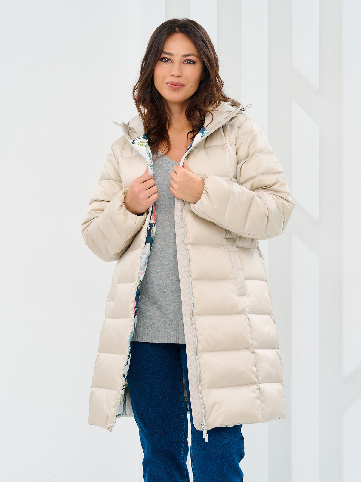 Пальто-пуховик женское прямого силуэта с высоким воротником и капюшоном произведено из прочного водоотталкивающего материала. Тканевая подкладка с уникальным принтом, напоминающим о летних цветущих полях и их обитателях, не оставит равнодушным никого. Застежка-молния с двухсторонним раскрытием. Изделие имеет втачной рукав, по низу имеется внутренняя фиксирующая резинка. На внутренней стороне куртки имеется накладной карман. На лицевой стороне полочки пуховика расположены функциональные карманы с листочкой и застежкой на кнопку. Объемный капюшон с резинками-фиксаторами позволяет укрыться от непогоды. Графическая стежка удерживает пуховой утеплитель, упакованный в двойной пух-пакет.