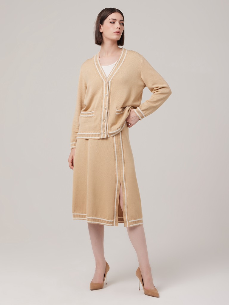 Трикотажный кардиган с V-образным вырезом и крупными дизайнерскими пуговицами. Манжеты рукавов, передние планки и низ отделаны резинкой, с комбинацией из пряжи белого цвета. Свободный кардиган классической расцветки с лаконичным стильным дизайном - не только универсальный элемент гардероба, но и идеальное дополнение к вечернему наряду.