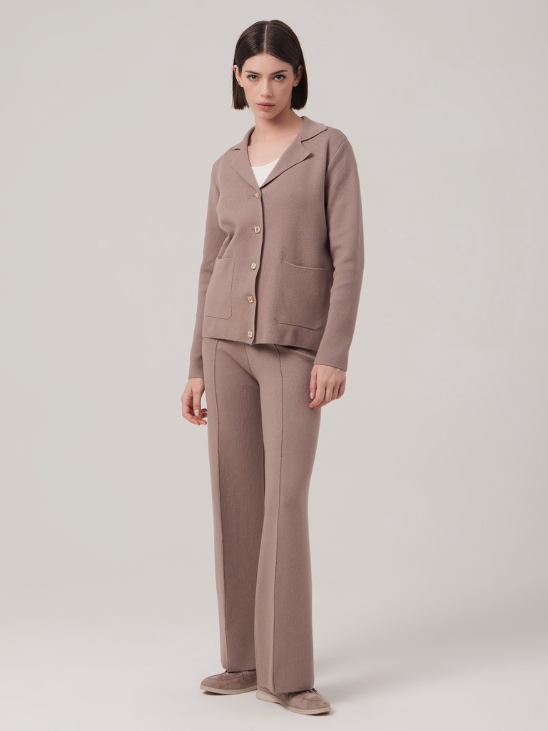 Базовый трикотажный жакет с V-образным вырезом и дизайнерскими пуговицами. Жакет нейтрального цвета с лаконичным стильным дизайном - универсальный элемент гардероба. В пару можно подобрать ультрамодные трикотажные брюки со стрелками аналогичного цвета.