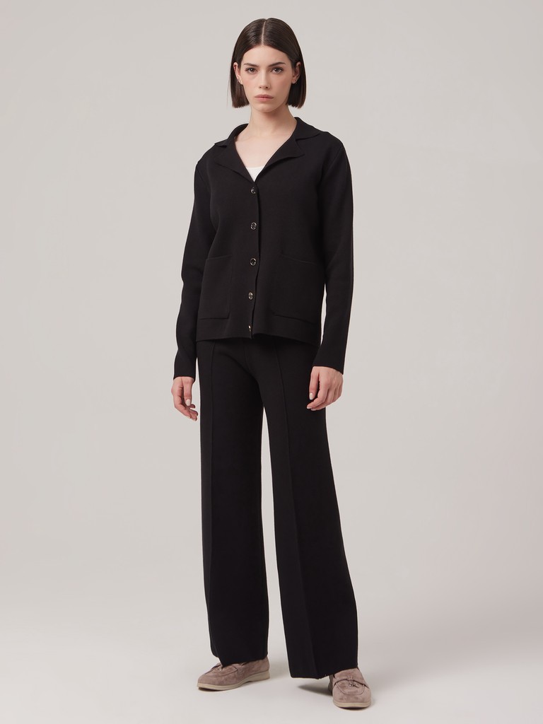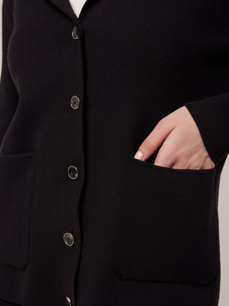 Базовый трикотажный жакет с V-образным вырезом и дизайнерскими пуговицами. Жакет нейтрального цвета с лаконичным стильным дизайном - универсальный элемент гардероба. В пару можно подобрать ультрамодные трикотажные брюки со стрелками аналогичного цвета.