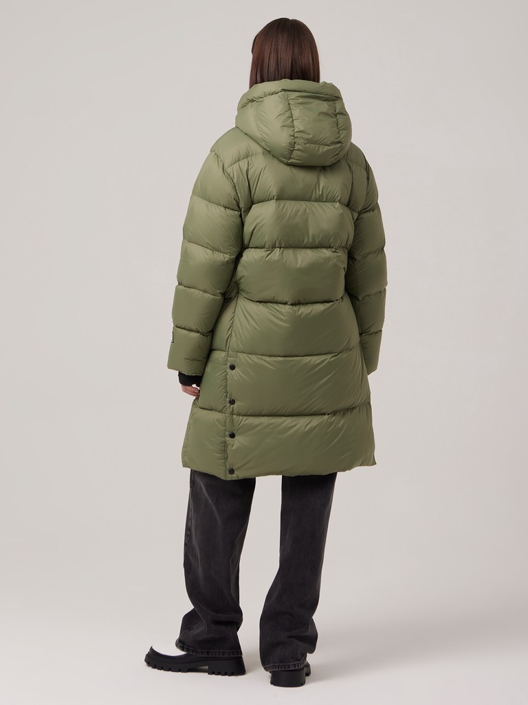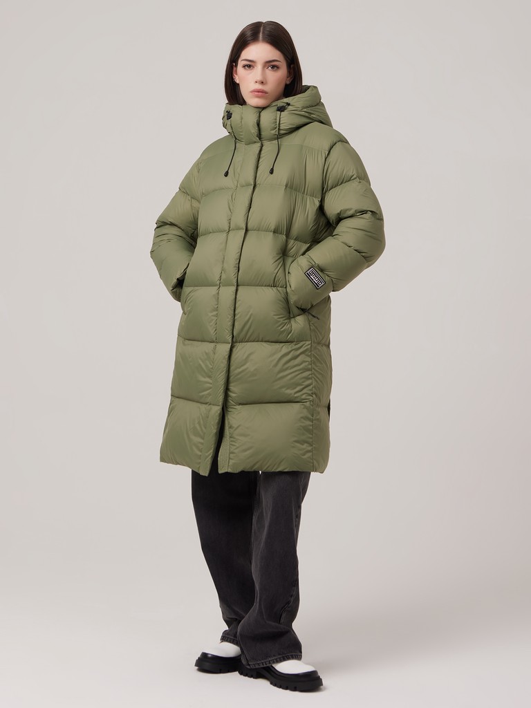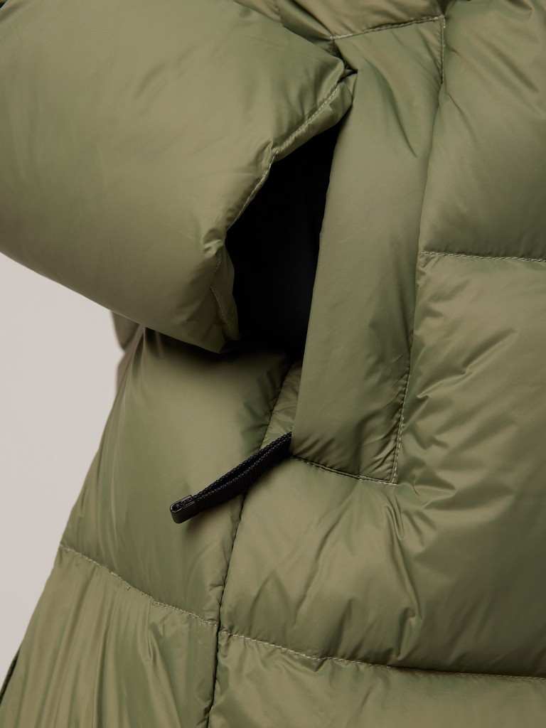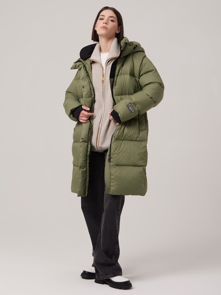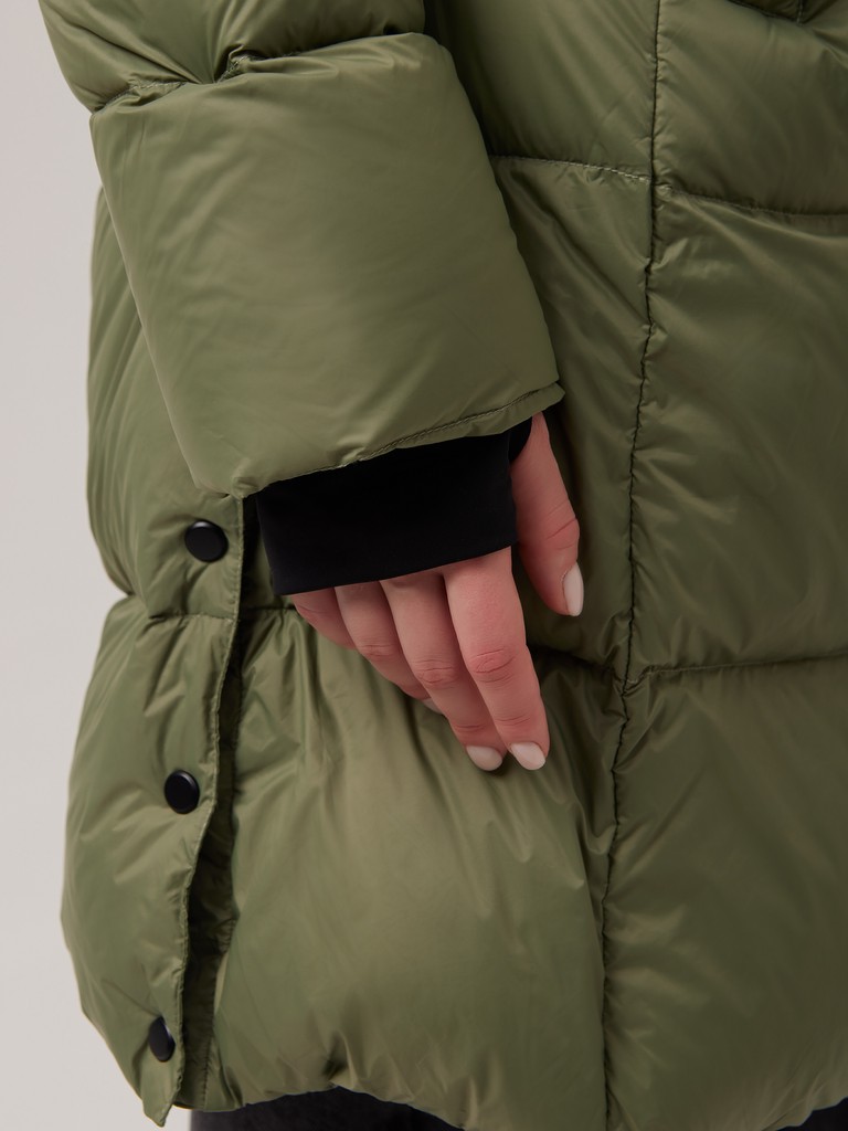 Женское пальто с капюшоном можно регулировать при помощи затягивающейся кулиски на талии. Так вы можете выбрать удобный вариант: прямого кроя/ оверсайз или приталенный силуэт. На изнаночной стороне изделия предусмотрены лямки из эластичной тесьмы для возможности ношения куртки на спине. В боковых швах есть разрезы с застёжкой на кнопки. Эта объемная уютная модель имеет влагозащитное покрытие и центральную молнию, трикотажные манжеты для дополнительной защиты от ветра.