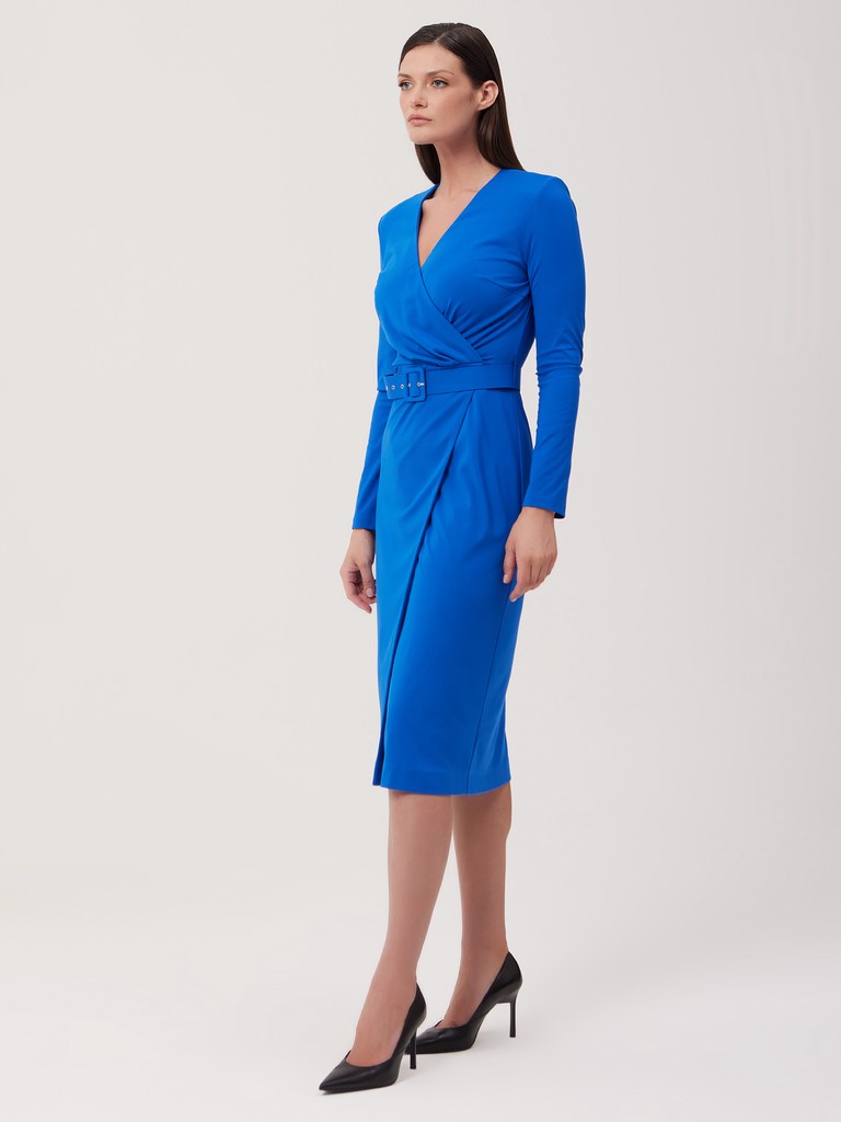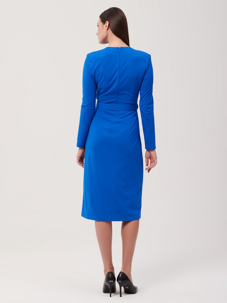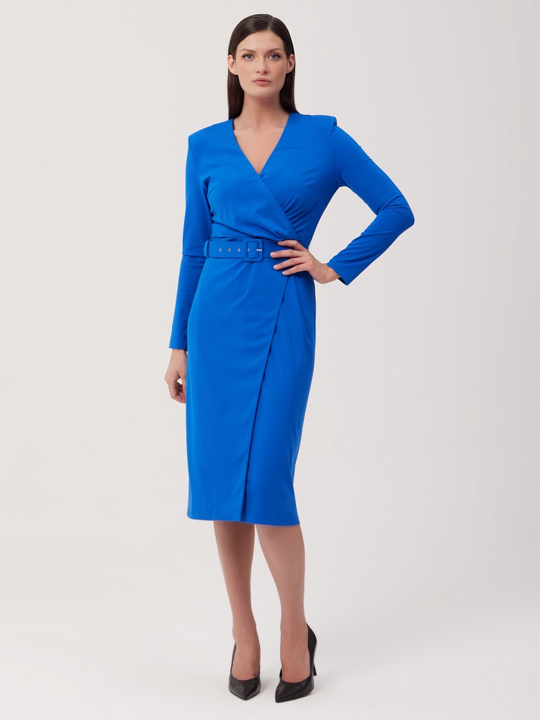 Платье имеет приталенный силуэт, который подчеркивает формы тела. Его длина чуть ниже колен, что делает его элегантным и подходящим для различных событий. Застежка находится в среднем шве спинки и представлена молнией, что обеспечивает легкость надевания и снятия платья. Платье имеет длинные втачные рукава, которые придают ему классический вид. Горловина V-образного выреза с защипами от линии талии и имитацией запаха придают платью женственность и изысканность. Нижняя часть платья также создает имитацию запаха передних полотнищ, что добавляет интересный детальный элемент. Обтяжной плотный пояс с обтяжной пряжкой дополняет модель, подчеркивая талию и создавая акцент на ней. Подплечники в платье являются удобными элементами, которые придают дополнительную поддержку и комфорт при ношении. Такое платье является стильным и элегантным вариантом для различных мероприятий, оно подчеркнет женственность и придаст утонченности образу.
