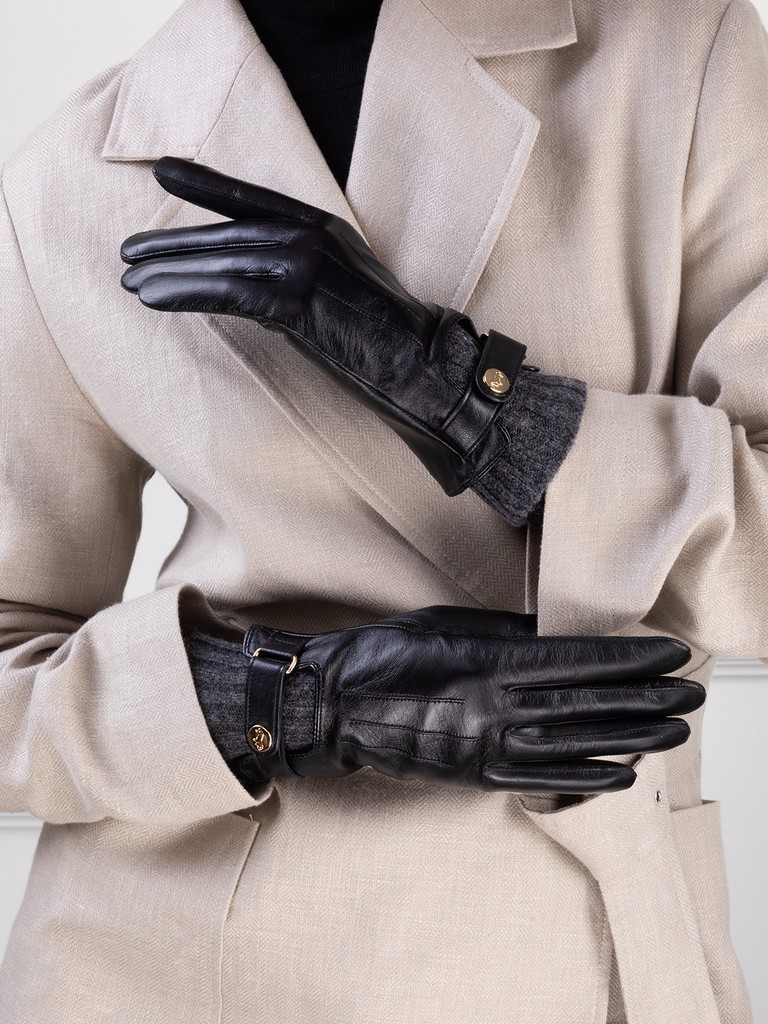 Перчатки женские торговой марки LABBRA производства Китай. Выполнены из натуральной кожи ягненка. Подкладка - 70% шерсть + 30% акрил. Декоративная отделка трикотажной манжетой и ремешком. Длина манжеты от нижней точки большого пальца до края перчаток - 4.5 см. Длина пальцев - средняя.