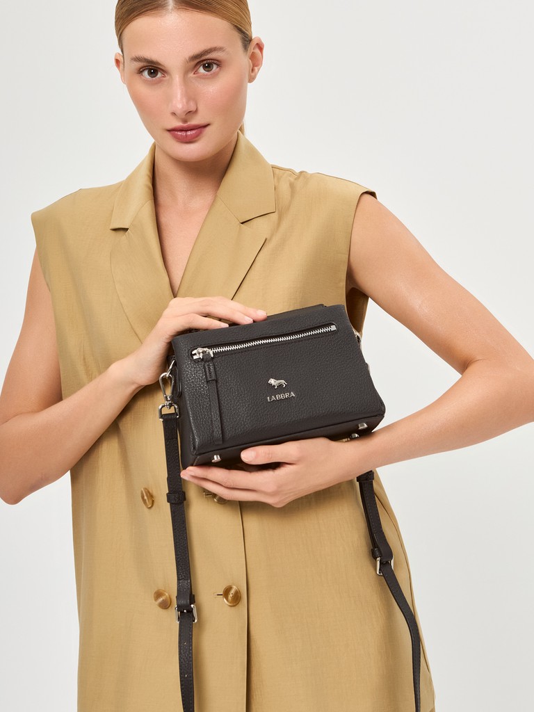 Женская сумка торговой марки Labbra из натуральной кожи. Модель застегивается на молнию. Содержит внутри один отдел, в котором имеются открытый карман и карман на молнии, по бокам имеются два отделения. На передней стенке есть карман на молнии. Максимальная длина съемного регулируемого плечевого ремня из натуральной кожи – 110 см, ширина – 1,5 см. Модель имеет ножки на дне. Не вмещает формат А4.