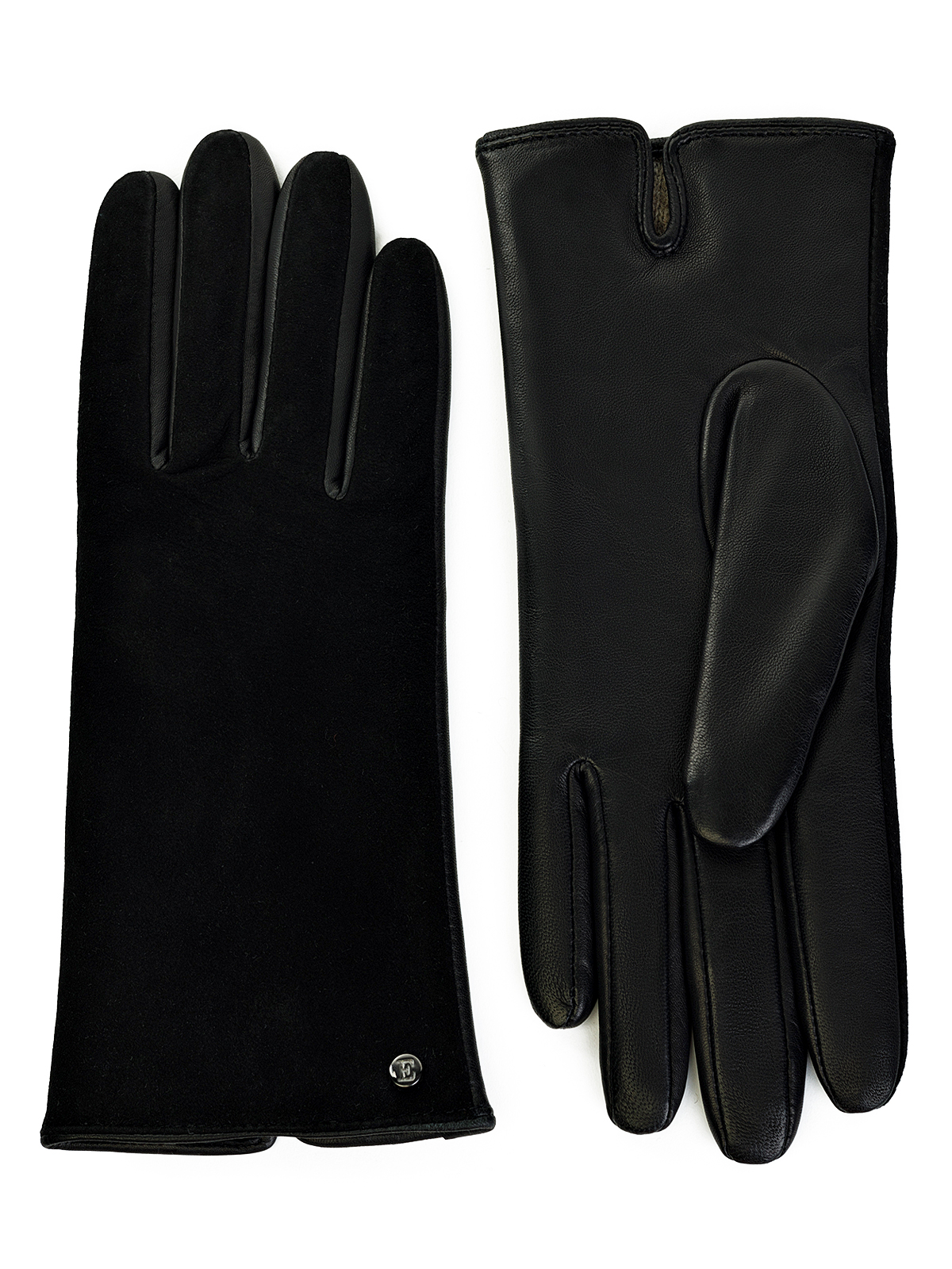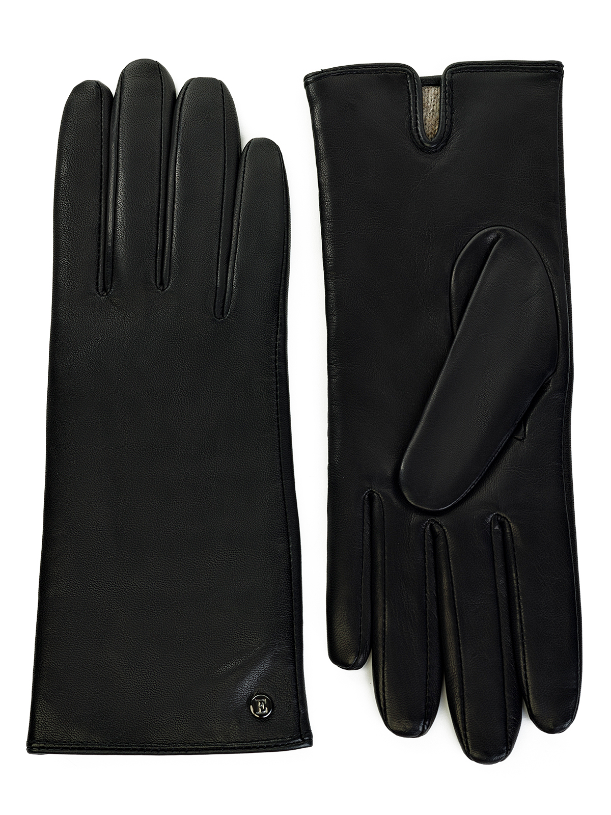 Перчатки женские торговой марки ELEGANZZA. Выполнены из эксклюзивной итальянской кожи ягнёнка на подкладе из шерстяной пряжи с добавлением кашемира. Манжеты украшены небольшой металлической эмблемой. Модель с удлиненными пальцами, длина манжеты от нижней точки большого пальца до края перчаток - 6 см.