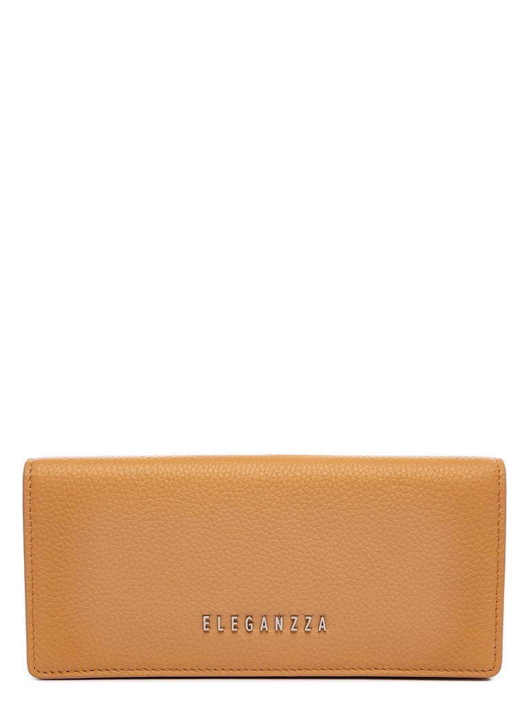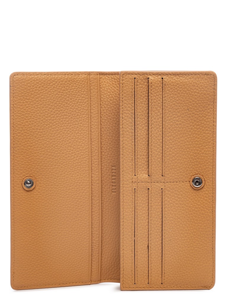 Женский кошелёк торговой марки Eleganzza из натуральной кожи. Модель закрывается на клапан с кнопкой и содержит внутри три открытых отделения, одно отделение, которое закрывается на металлическую молнию, шесть отделений для кредитных и дисконтных карт.