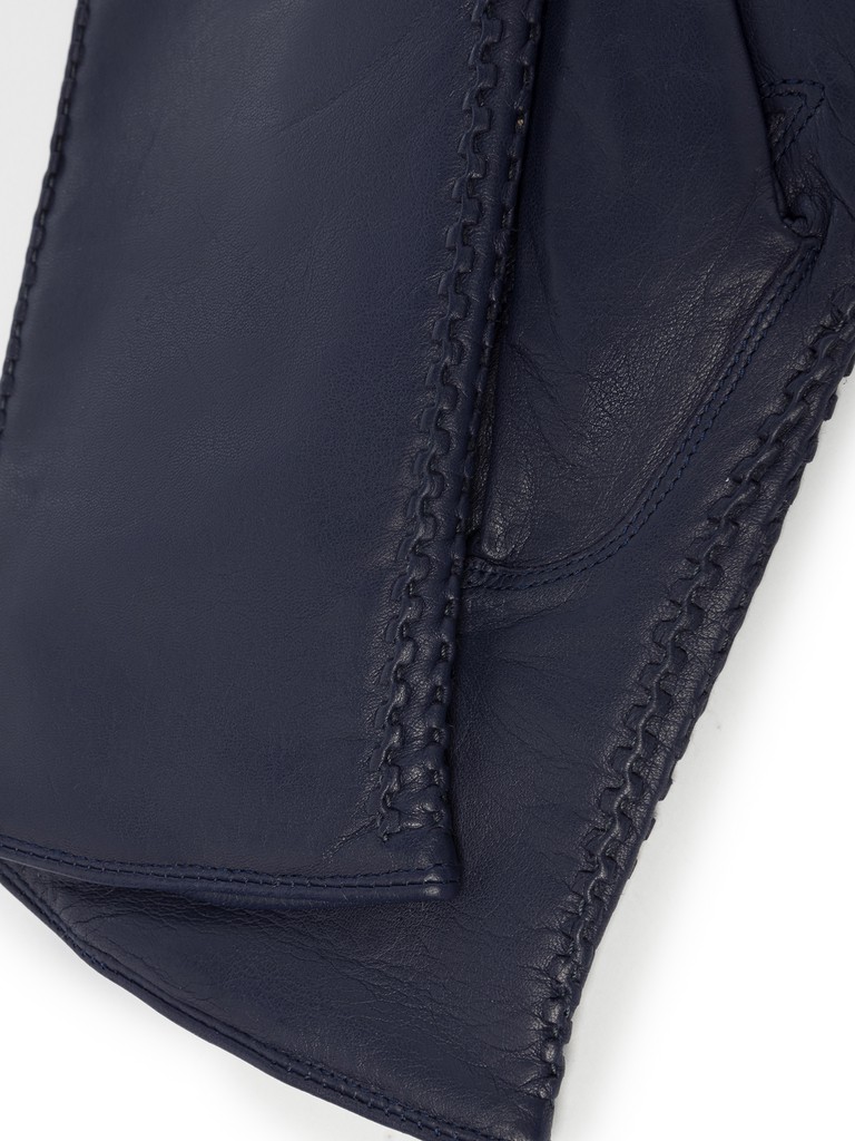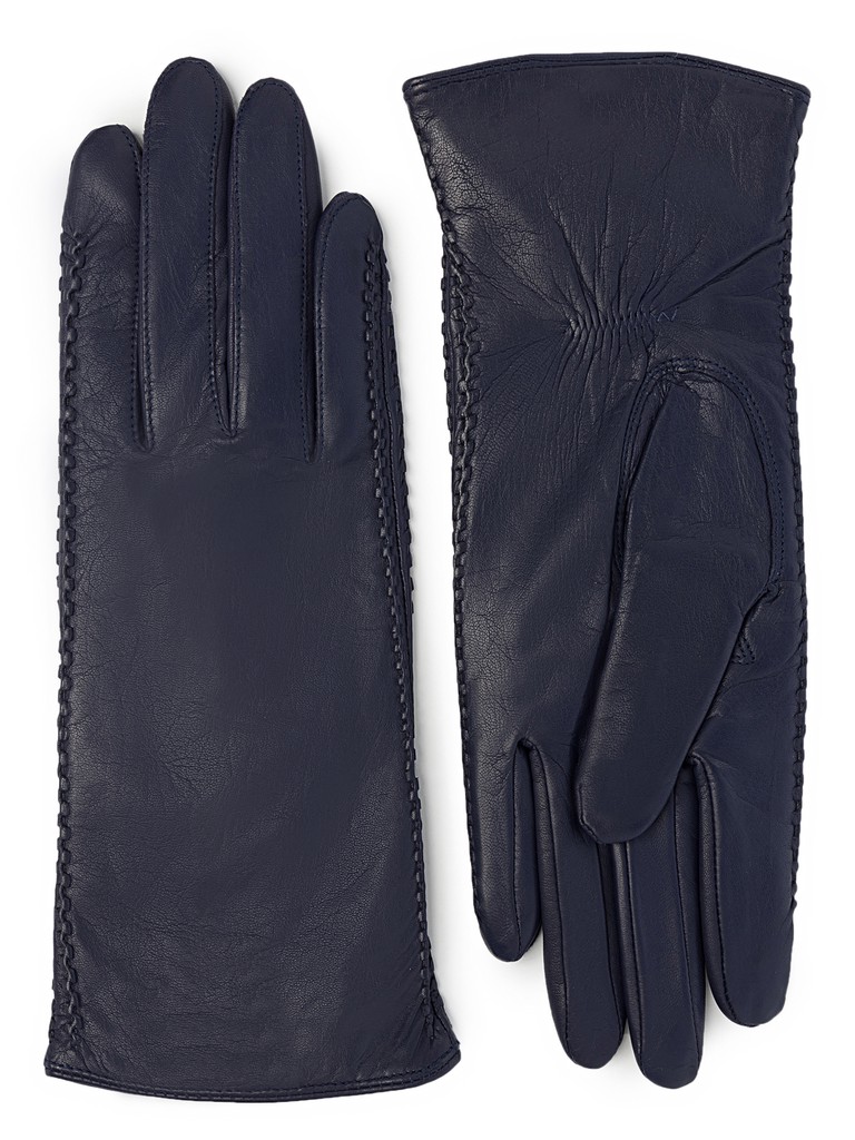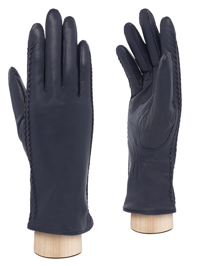 Перчатки женские торговой марки ELEGANZZA из натуральной кожи ягнёнка производства Италия. Подкладка: 85% шерсть + 15% кашемир. Отделка - два декоративных шва "метеор": вдоль указательного пальца и мизинца. Нижний край перчатки окантован. Длина манжеты от нижней точки большого пальца до края перчаток - 7,5 см. Длина пальцев - средняя.
